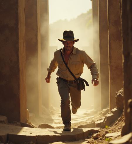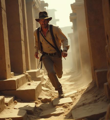 - 80mm lens. F2.8. . photography. f/2.8 , bokeh, outdoor,, a4nh8, man, races through the collapsing temple, leaping across ruins as the walls close in tighter and tighter, Indiana Jones Style
