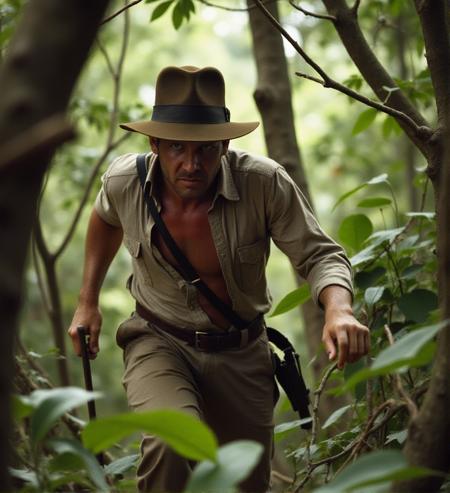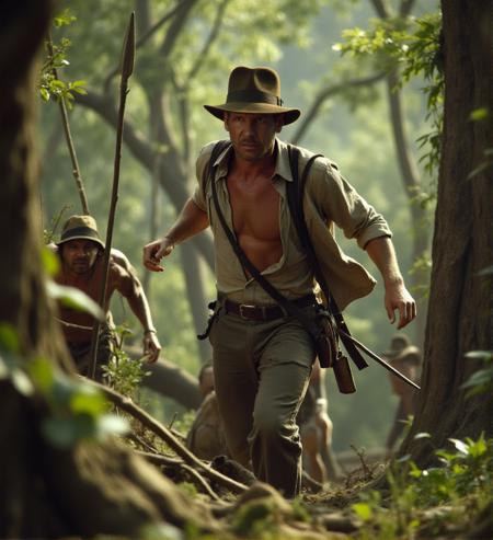- 80mm lens. F2.8. . photography. f/2.8 , bokeh, outdoor,, a4nh8, Indy escapes the jungle chased by a tribe armed with spears, carving his way through dense trees and thorny branches, Indiana Jones Style