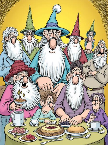 - d0nm4rt1n. Whimsical cartoon illustration in the style of Don Martin, depicting Wizard Whitebeard's family reunion. A large family gathering consisting of several wizards in all ages, all with white beards.