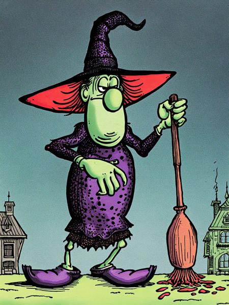 - d0nm4rt1n. Whimsical cartoon illustration in the style of Don Martin. The Wicked Witch of the West