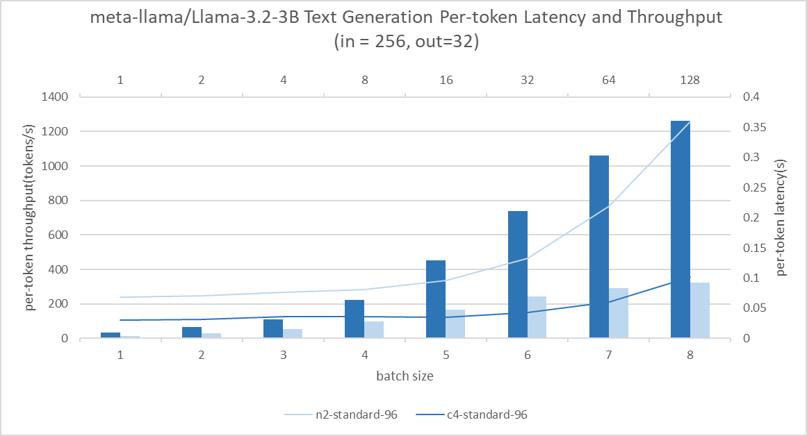 Consistently, the C4 instance shows approximately 2.3x to 3.6x higher throughput over N2 in the text generation benchmark. Across batch sizes of 1 to 16, throughput is 13x better without significantly compromising latency. It enables concurrent query serving without needing to sacrifice user experience.