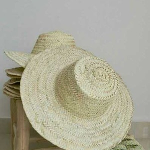 a taraza with a wide brim and a simple, natural design. The hat is resting on a surface stacked with others in the background.