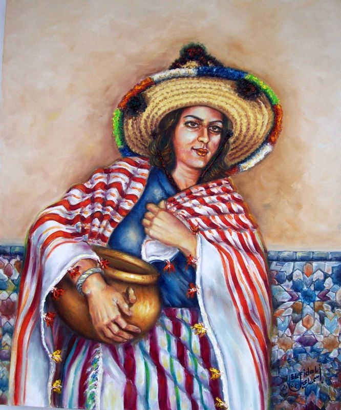 a woman wearing a colorful, striped robe and a taraza adorned with colorful ribbons