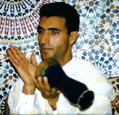 a man in a colorful floral tunic plays a guembri against a blue wall