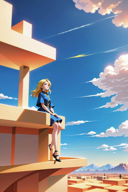 - anime style, 1girl, woman, beautiful, golden hour, blue sky, clouds, scenery, "at the indescribable Symposium"