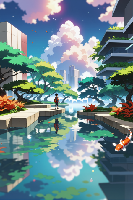 - anime style, 1boy, man, ruggedly handsome, koi pond in a city park in a great fantasy cloud metropolis beyond the end of reality, masterpiece