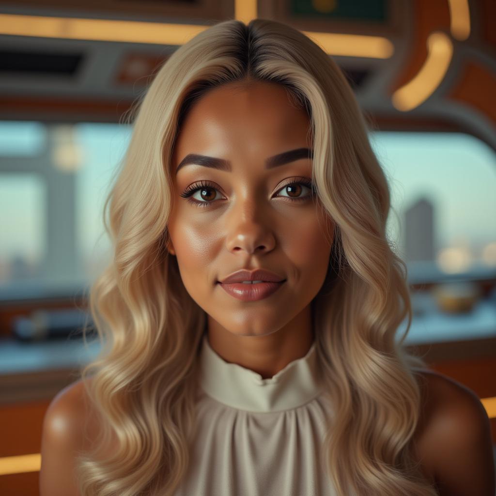 - mdjrny-v6 style, headshot of a woman high contrast, Screengrab of 1950's Super Panavision 70 movie. Retro in colour. a stunning Blonde 19 year old woman in a 50's style space age setting --no black bars. Professional, clear, neutral background, focused