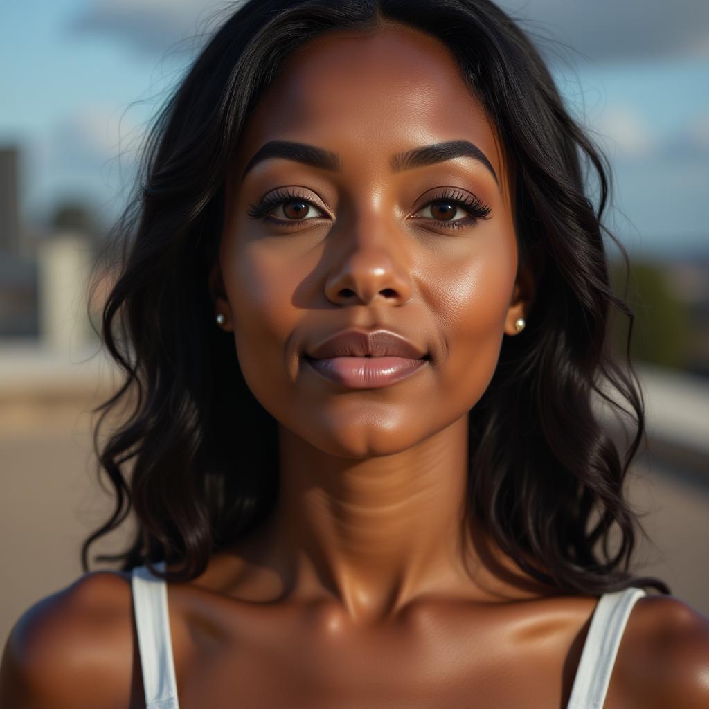 - eye level shot photo of (Ashantia_Malia_Suzuki) a woman photographed by James White in the 3DCG Style, Hollywood Studio outdoors
