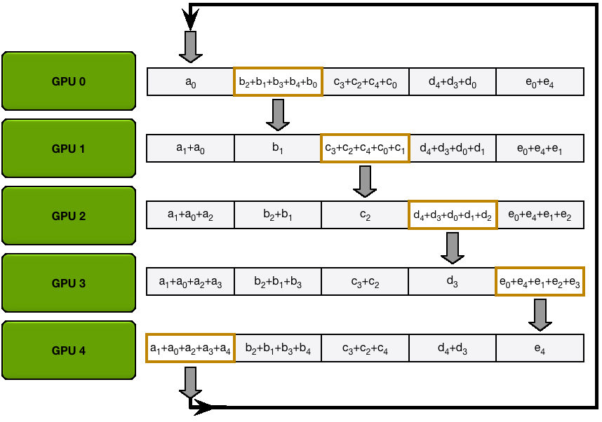 <p>The general setup is that we have a number of independent nodes which could be CPU cores, GPUs, or compute nodes. Each performs some computation and then we want to communicate the result or parts of it to the other nodes for the next computation step (t+1).</p>