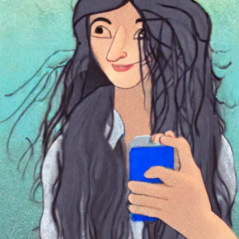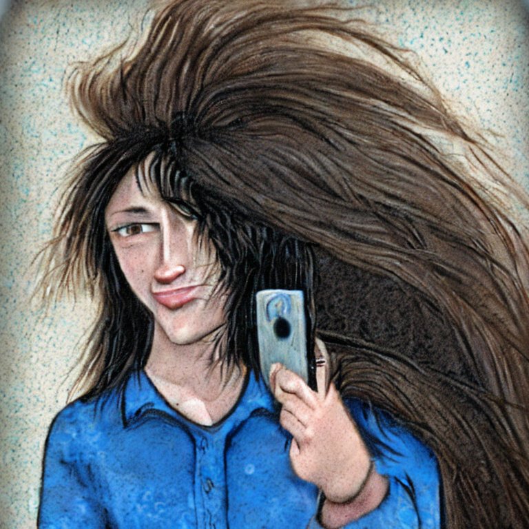 a close up of a person holding a cell phone, the woman has long dark hair, digital camera, ((portrait)), by Jean Cunningham, with a halo of unkempt hair, twitter pfp, loosely cropped, cougar, blue shirt, author, silver shaggy hair, flirty, grainy damaged photo, georgia anne muldrow, deviantart