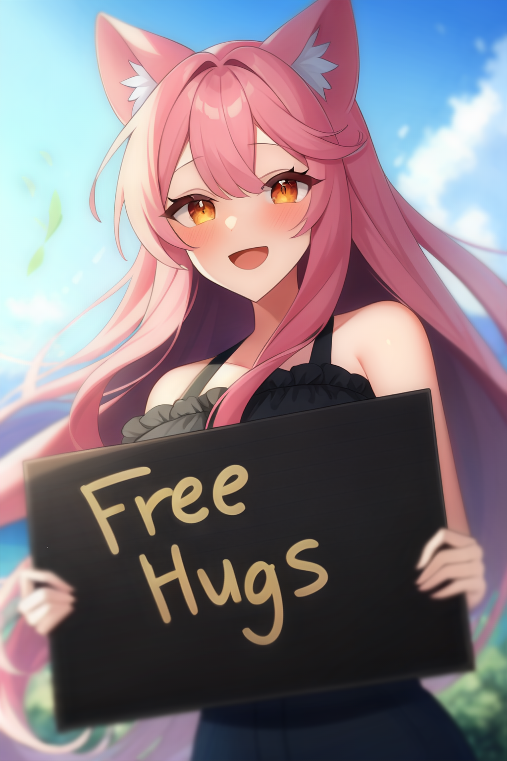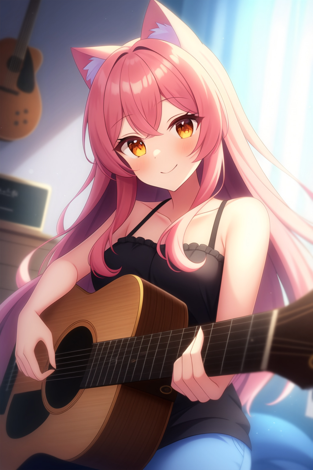 prompt = "newest, extremely aesthetic, best quality, 1girl, solo, cat ears, pink hair, orange eyes, long hair, bare shoulders, looking at viewer, smile, indoors, casual, living room, playing guitar,"