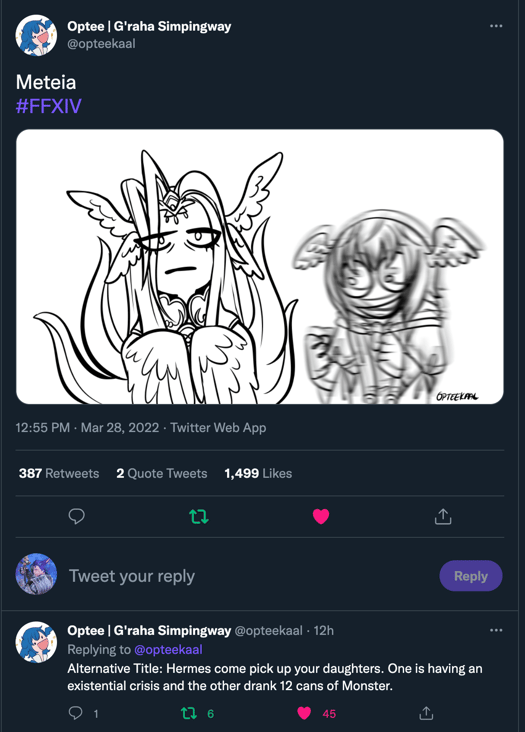 Final Fantasy XIV, Meteion is a charachter in the most recent of expansions 6.0 / Endwalker. This includes both her WORLD ENDING form, and her birb form as well as her existenial crisis she needs a snickers and a can of technicolor goo.