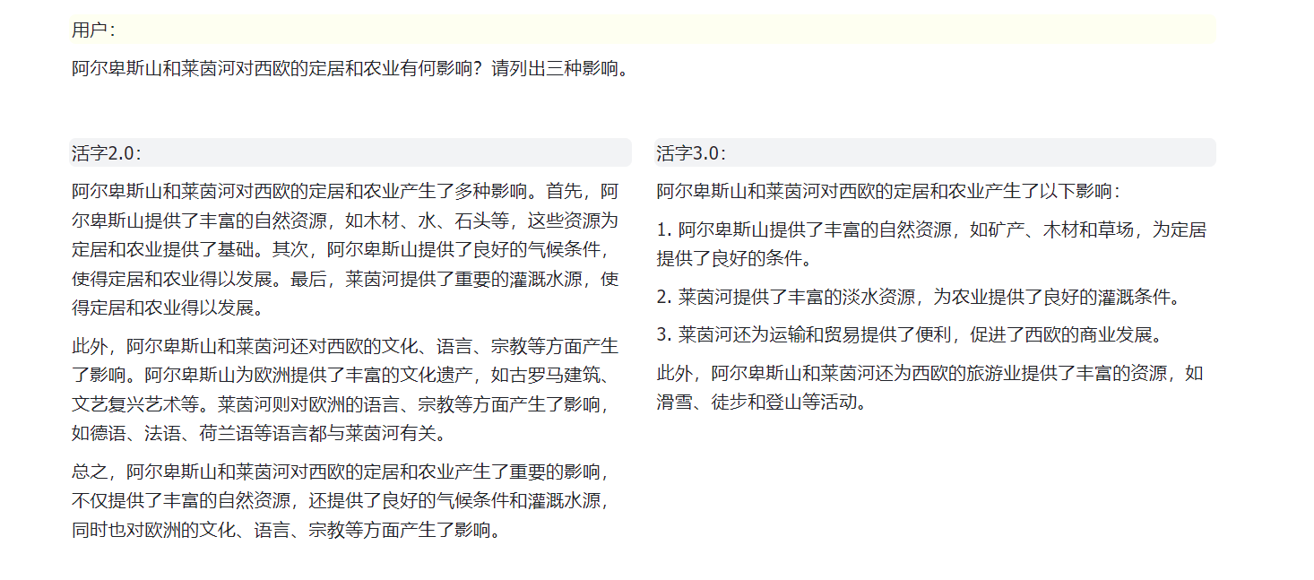 - 在活字1.0基础上,通过人类反馈的强化学习(RLHF)进一步优化了模型回复质量,使其更加符合人类偏好。相较于上一个版本平均长度明显提高,遵从指令的能力更强,逻辑更加清晰。