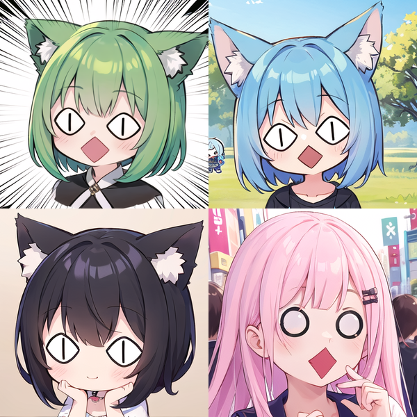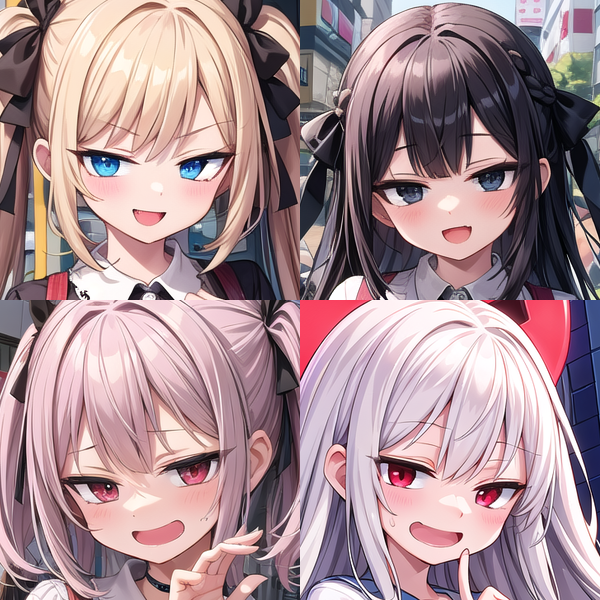 また、例えば、眼だけは吊り目にしたいという場合、このLoRAを使うのではなく、「V字形眉(ドヤ顔他)」「吊り目」「八重歯付きのニヤけた口」の3つを同時に適用することで再現できます。