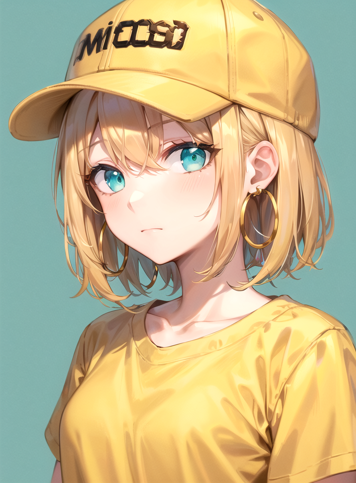 masterpiece, best quality, 1girl, aqua eyes, baseball cap, blonde hair, closed mouth, earrings, green background, hat, hoop earrings, jewelry, looking at viewer, shirt, short hair, simple background, solo, upper body, yellow shirt