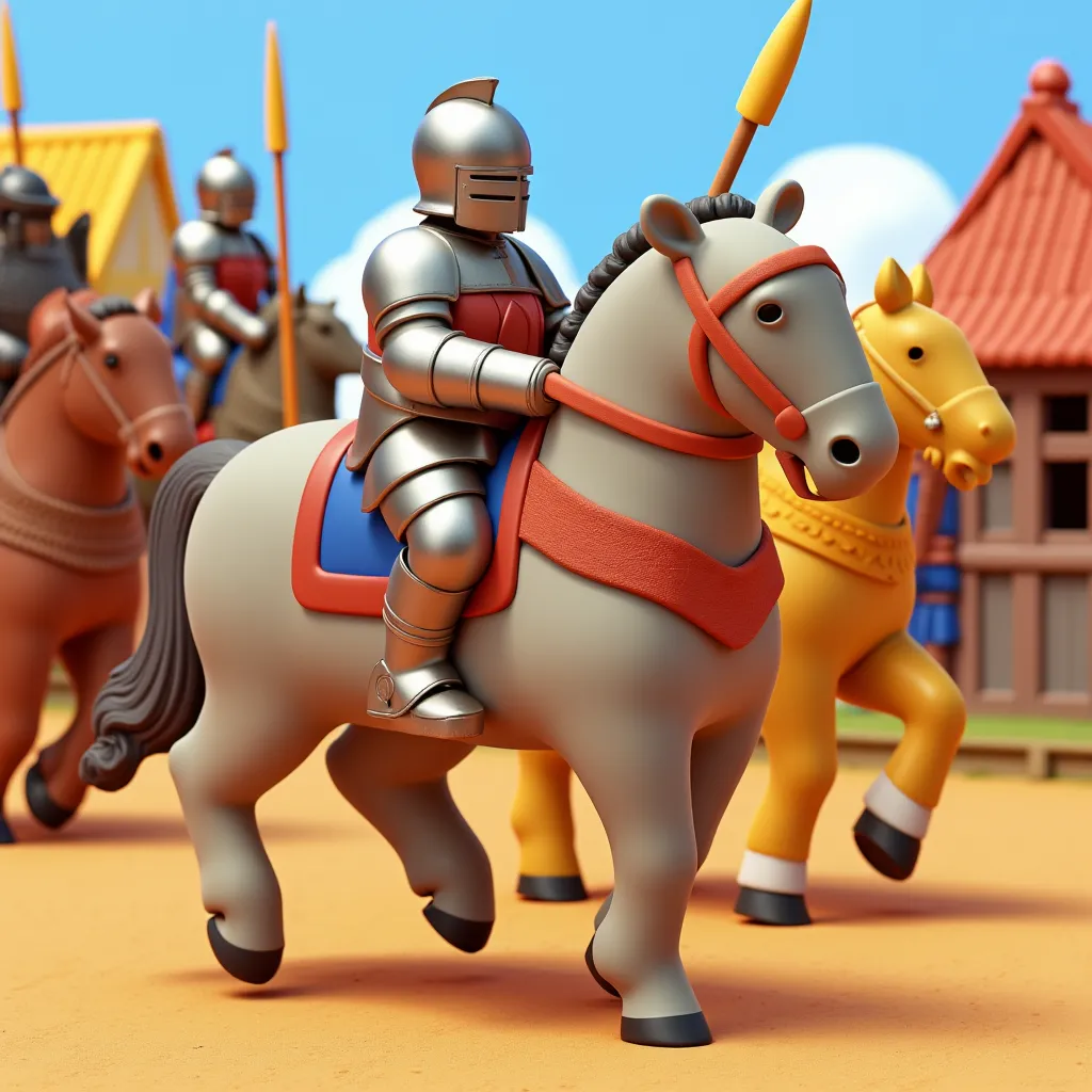 - NEOCUTE3D of Picture a valiant knight in shining armor, mounted on a gallant steed, charging with a lance towards an opponent in a lively medieval fair setting