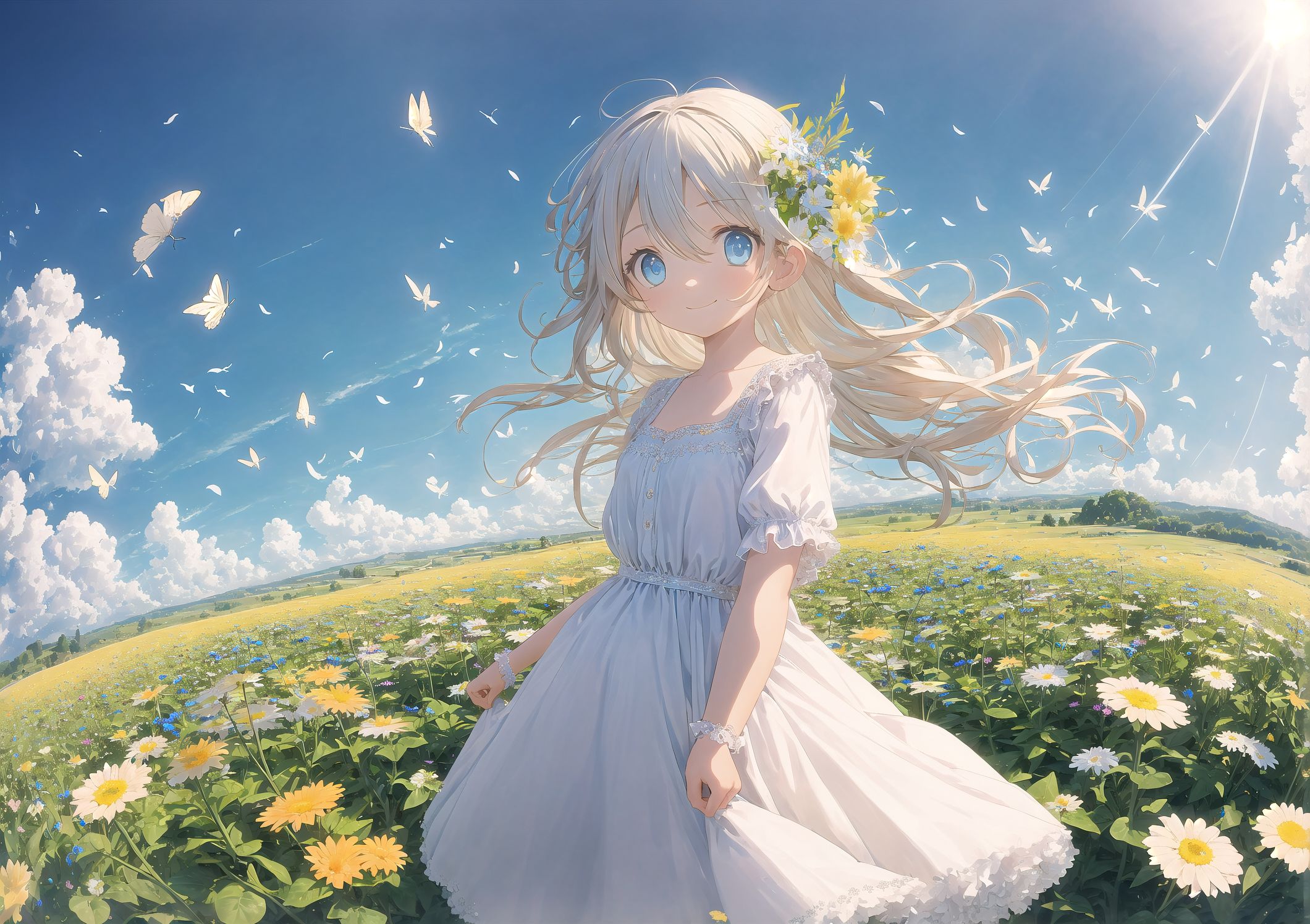 Prompt: ((solo:1.2)),portrait,cute little girl standing in a vast flower field,silver long hair,blue eyes,white dress,blush,smile,cowboy shot,blue sky,(petals:1.2),(overlooking:1.3),(fisheye),wind,(magnificent panorama view:1.2),(chromatic aberration:1.2),(butterfly:0.9) Negative prompt: (re-badprompt:1.1), (worst quality, low quality:1.2), (urgly:1.2), (scratch, crack, scale, freckles, cheeks, cosmetic, make up, lipstick, Blood paste, blood vessel:1.4), (tattoo, tears, sweat:1.2), (tooth, nail:1.4), (text:1.5), (china, chinese:1.4), (bad_anatomy, bad_hand:1.4) Steps: 60 Sampler: DPM++ SDE Karras CFG scale: 7.5 Seed: 1944831104 Size: 848x600 Denoising strength: 0.55 Clip skip: 2 Hires upscale: 2.5 Hires steps: 20 Hires upscaler: Latent
