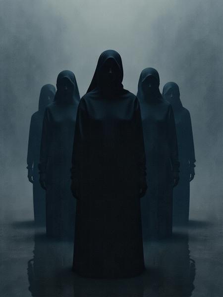 - spectral glow. A group of mysterious figures completely shrouded in dark, flowing fabric, standing in a misty, stormy environment. The setting is dimly lit with an ominous, supernatural atmosphere. The fabric appears heavy and textured, blowing slightly in the wind, obscuring all facial features. A faint light source in the background creates dramatic highlights on the fabric. The ground beneath them is reflective, resembling water or a wet surface, subtly mirroring their forms. The color palette is dominated by monochromatic shades of gray, blue-gray, and black, emphasizing the eerie and ethereal mood.