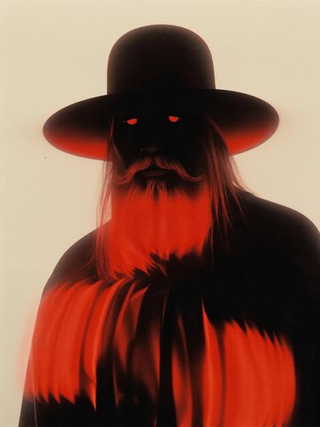 - inverted negative film. light leak effect, spectral glow, chromatic grain, motion blur, light pollution. Black and vibrant red and beige. Light background. Diffuse silhouette of Wizard Whitebeard with a long white beard. Distorted. Prism effect. Long exposure. subtle noise grain.