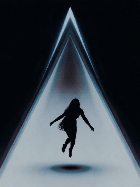 - Triangular Symmetric Symmetry compsition. She is falling up. A pyramid triangle geometric shape. Dark of contrast blue and black.