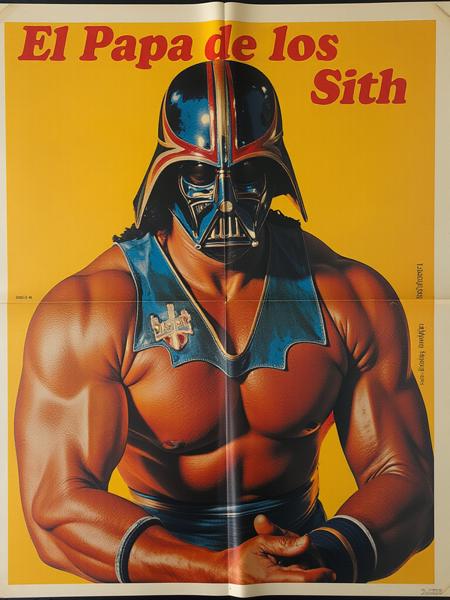 - lucha libre poster, featuring a wrestler with a darth vader mask flexing his muscles