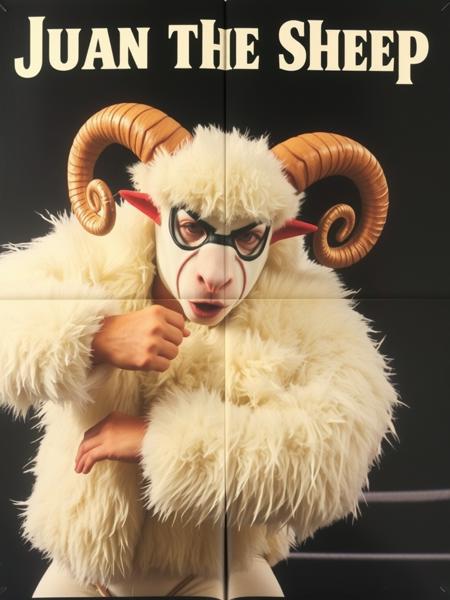 - lucha libre poster, featuring Shaun The Sheep as a luchador, in a dynamic pose, wearing a white fluffy sheepskin pelt and large spiral ram horns. Title says "Juan The Sheep"