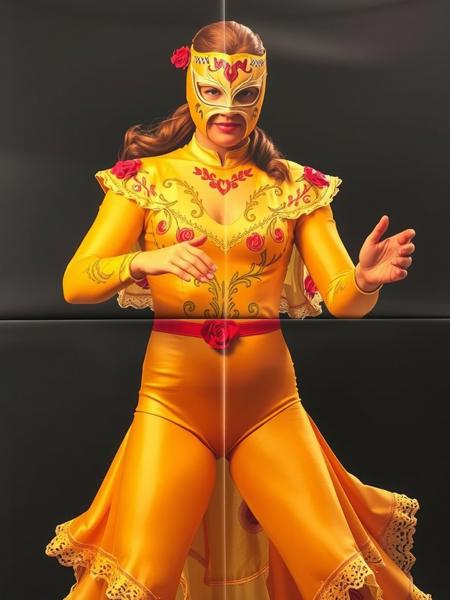 - lucha libre poster, featuring Belle from 'Beauty and The Beast' as a luchador, her costume a refined blend of her ballroom gown and wrestling gear. The bodysuit is a rich golden-yellow, featuring intricate rose patterns embroidered across the fabric, reflecting the elegance of her famous dress. Her mask is a soft gold with delicate rose and vine designs in deep red, leaving her warm, intelligent eyes exposed. Belle’s chestnut brown hair is tied back in a loose, flowing ponytail, with a single rose pinned to the side. A regal, flowing cape resembling her ballroom skirt trails behind her, fluttering as she moves. Her boots and gloves are adorned with delicate lace-like detailing, reminiscent of her gown’s ruffles. Around her waist, a slim red belt with a rose emblem serves as a nod to the enchanted rose from the Beast's castle.