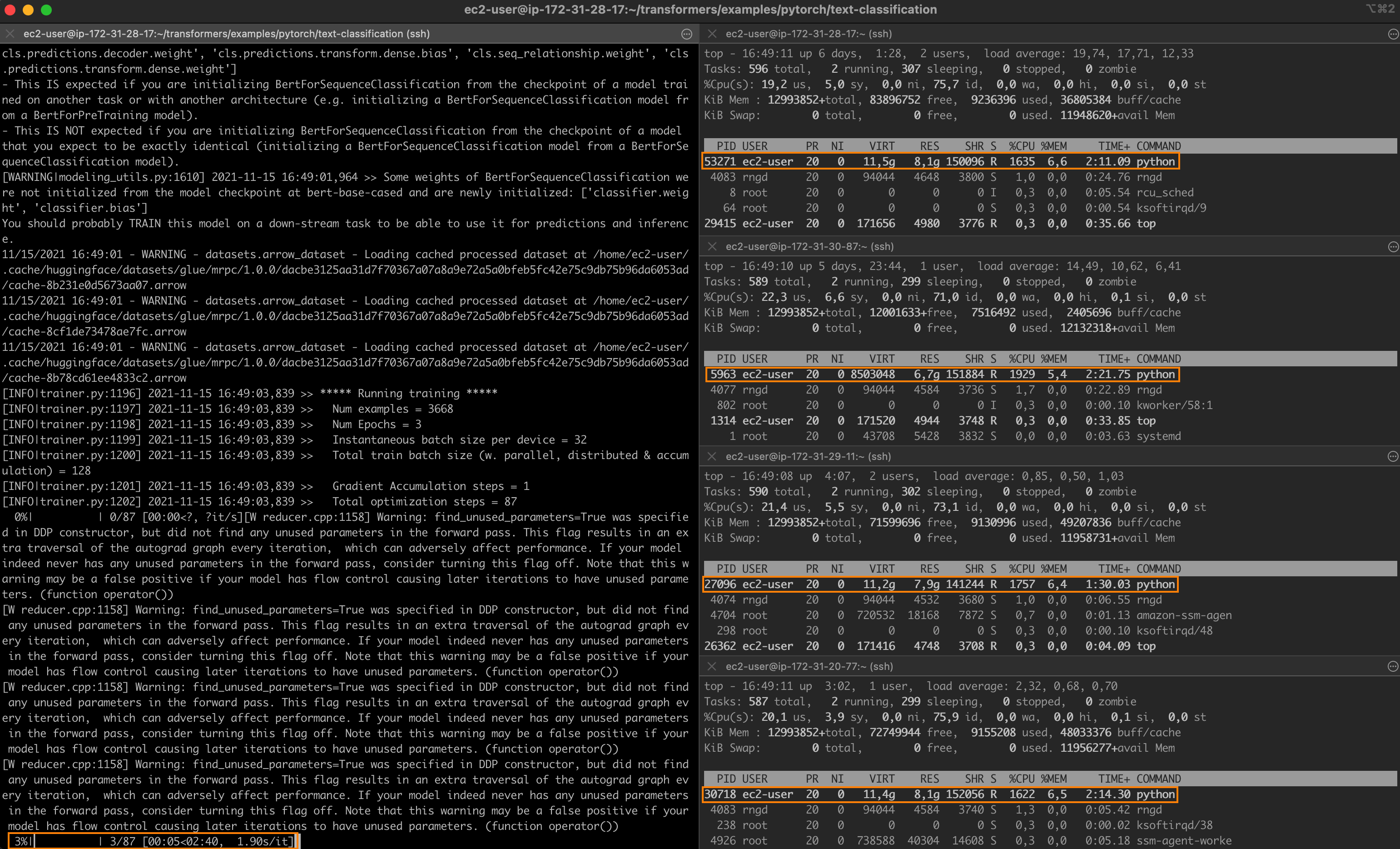 To get a baseline, let's launch a single-node job running the run_glue.py script in transformers/examples/pytorch/text-classification. This should work on any of the instances, and it's a good sanity check before proceeding to distributed training.