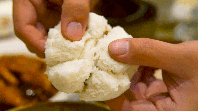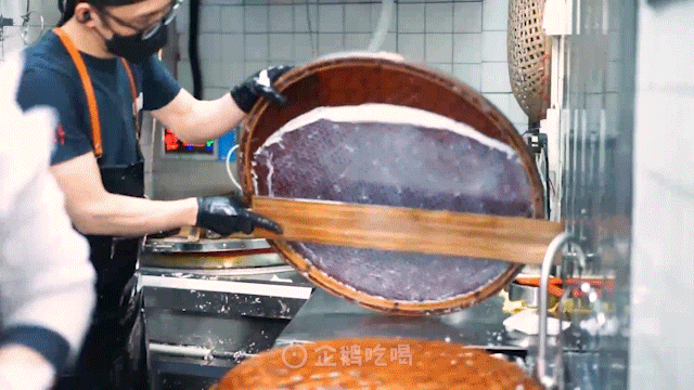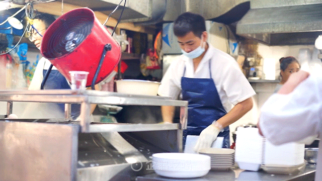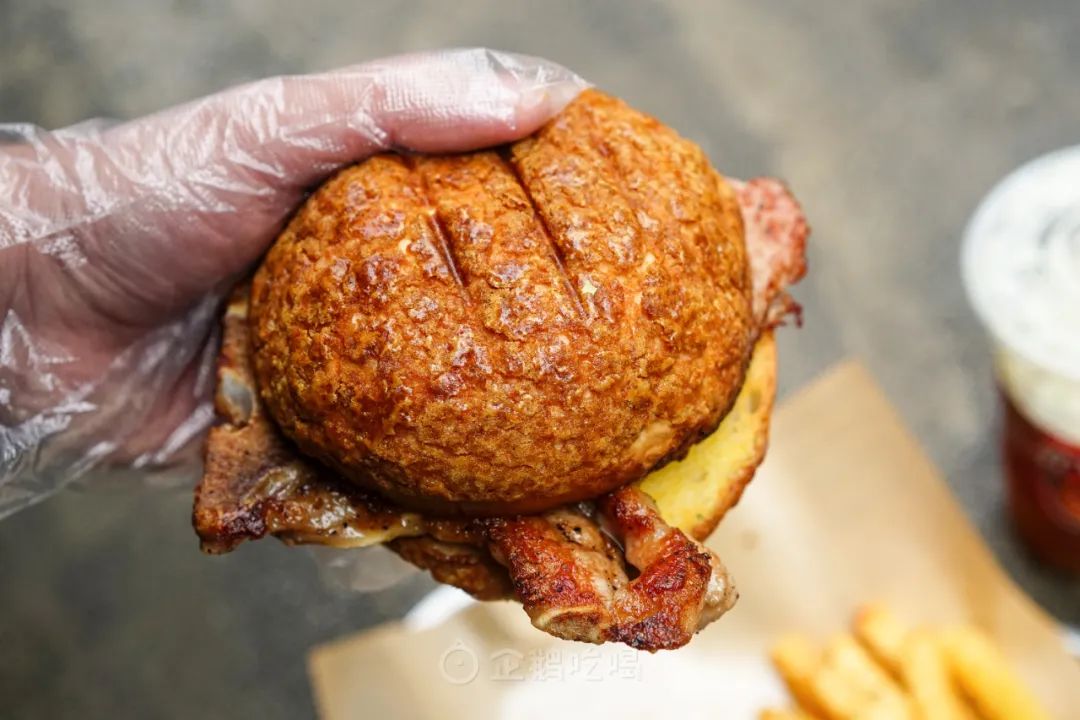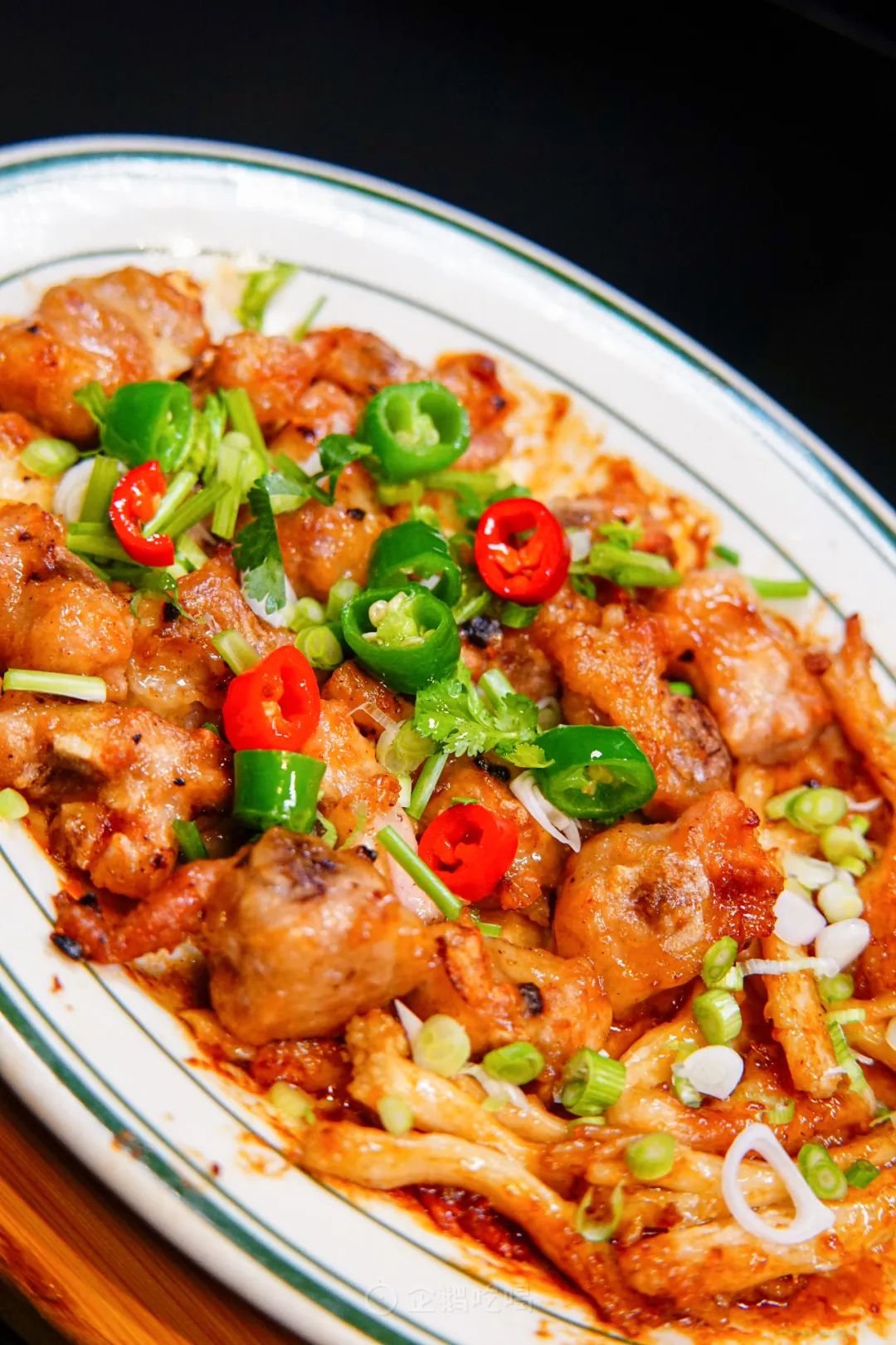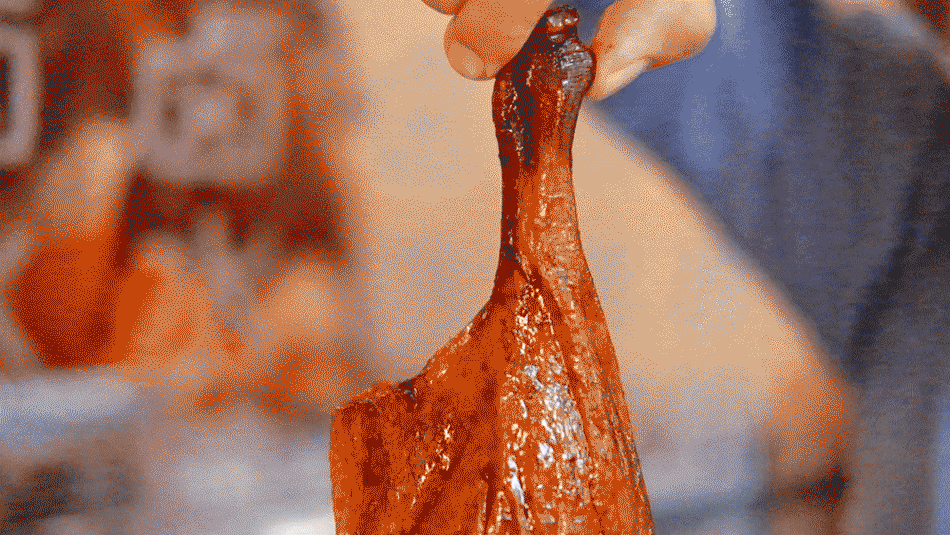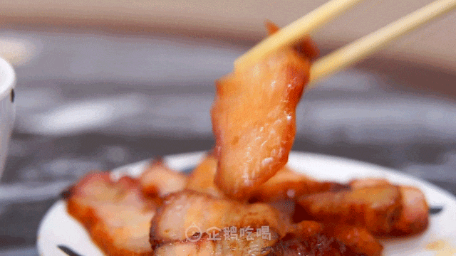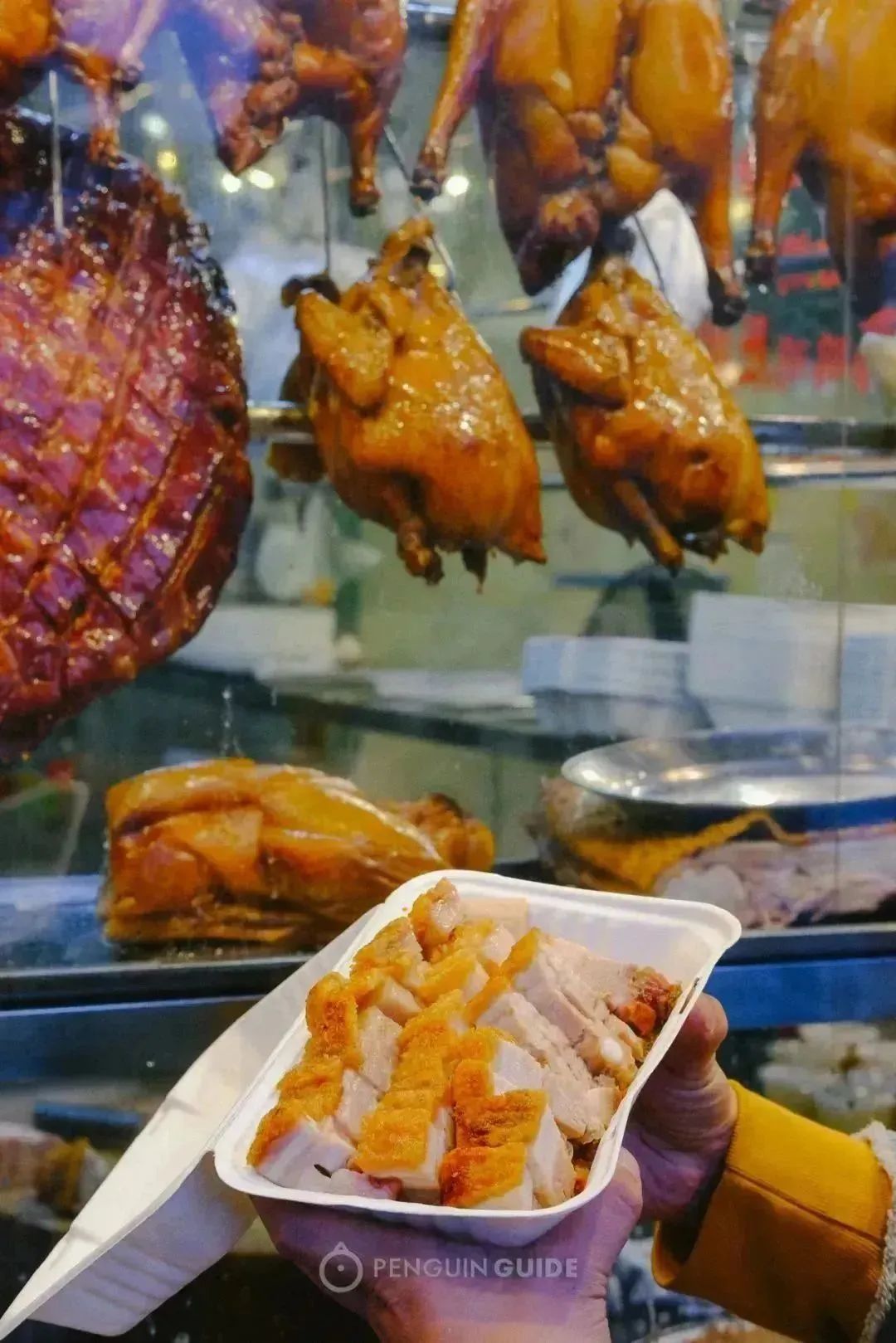 这手速如神,鸡肉在动亦未动之间,已经包裹上丰盈汁酱了。因为胜记是当地手撕鸡的出名品牌,许多手撕鸡店都会叫自己“胜记”,大家请认准胜记万利烧腊这个名字,看准文末的地址,不要去错店家哦。选的是肥瘦分布均匀的骨腩肉,烤完之后瘦肉不柴,肥美多汁。最绝是这层爆皮,入口嘎嘣酥脆,皮下油脂已化,嚼起像酒心巧克力一样溢出猪油浓香。