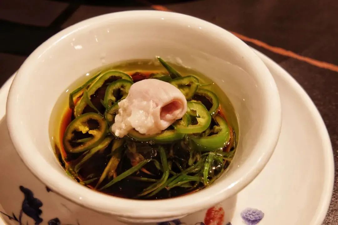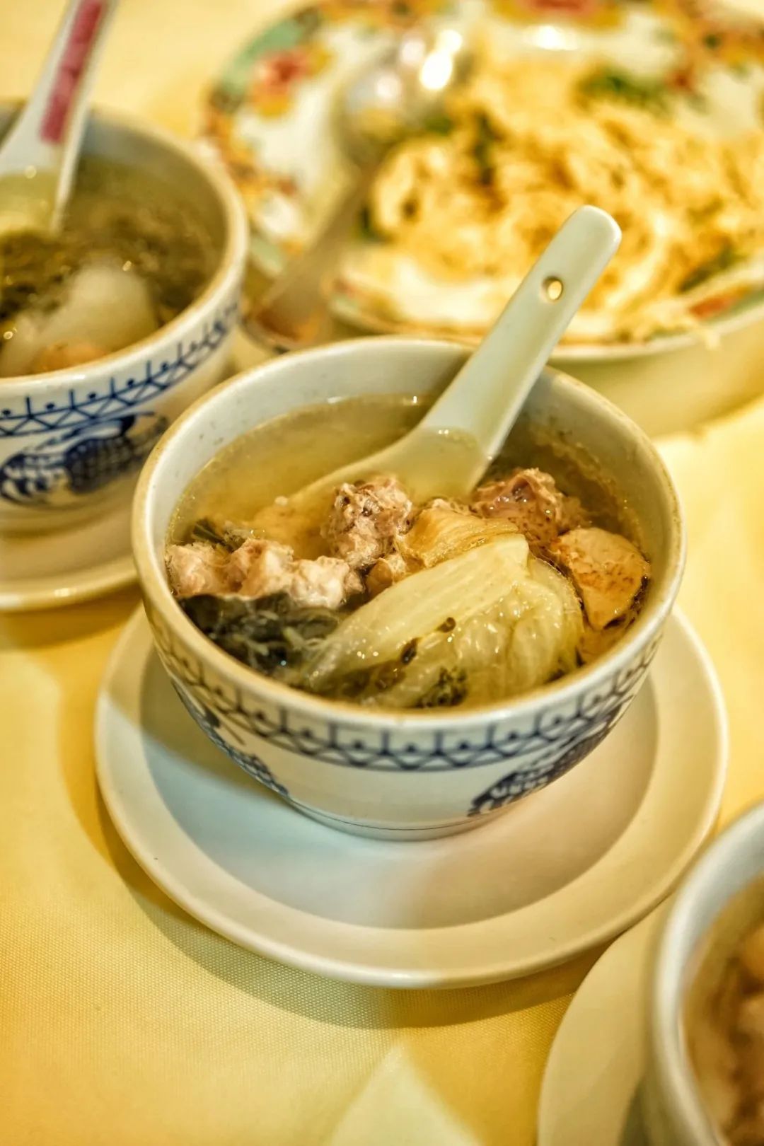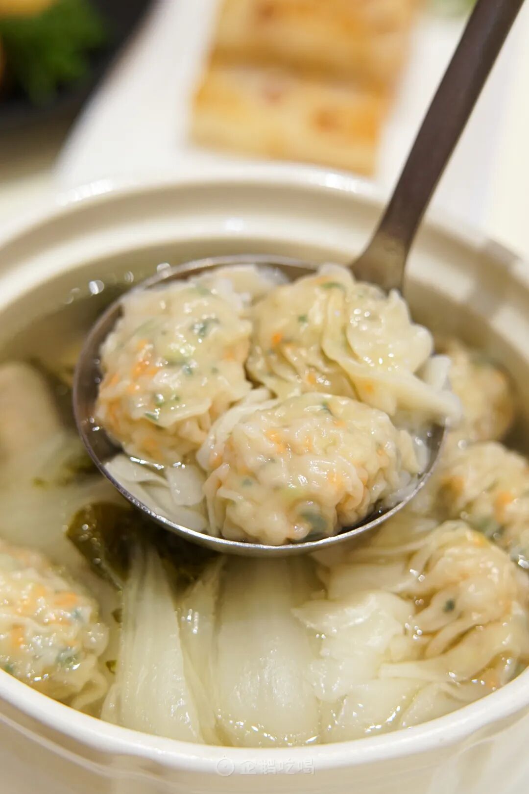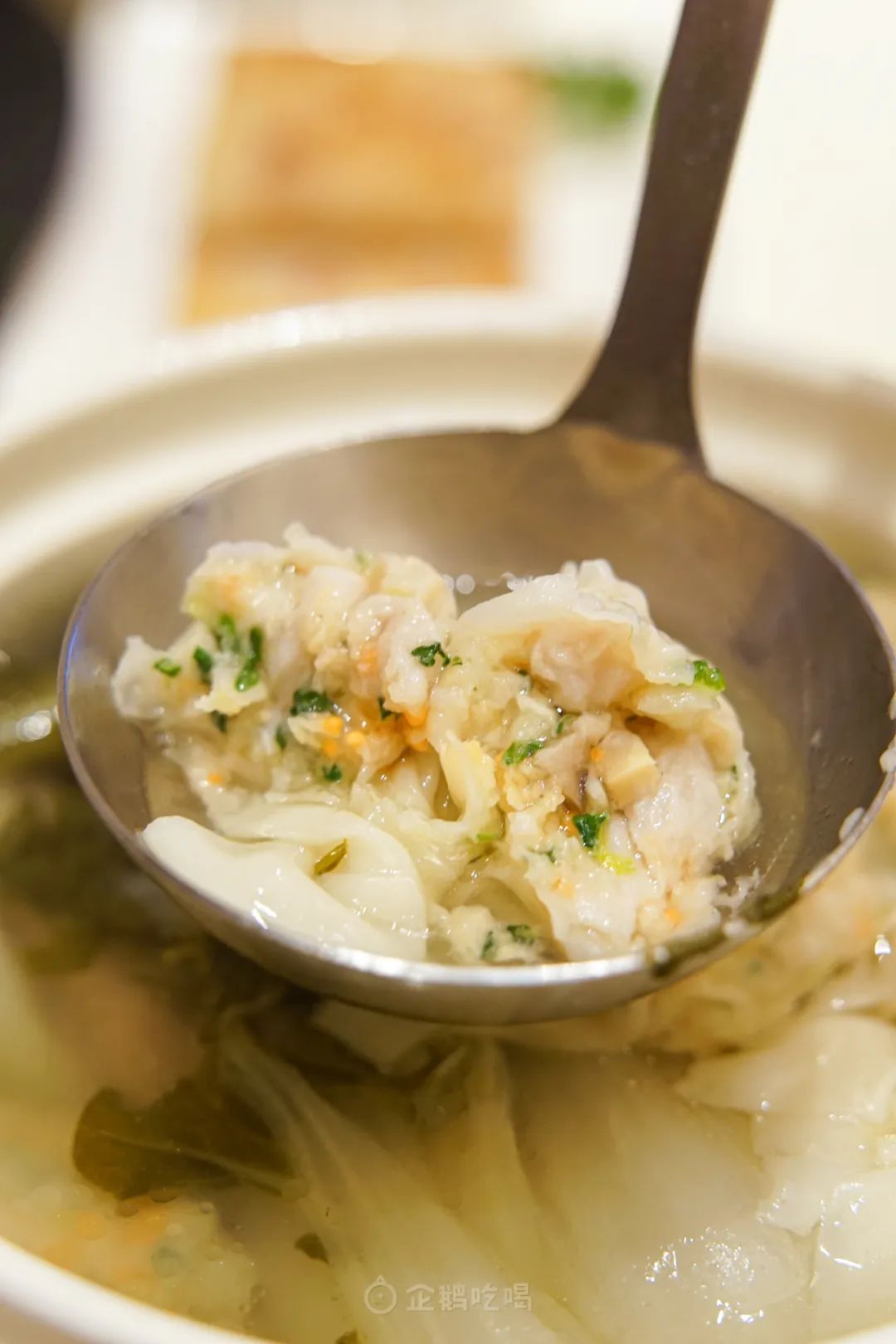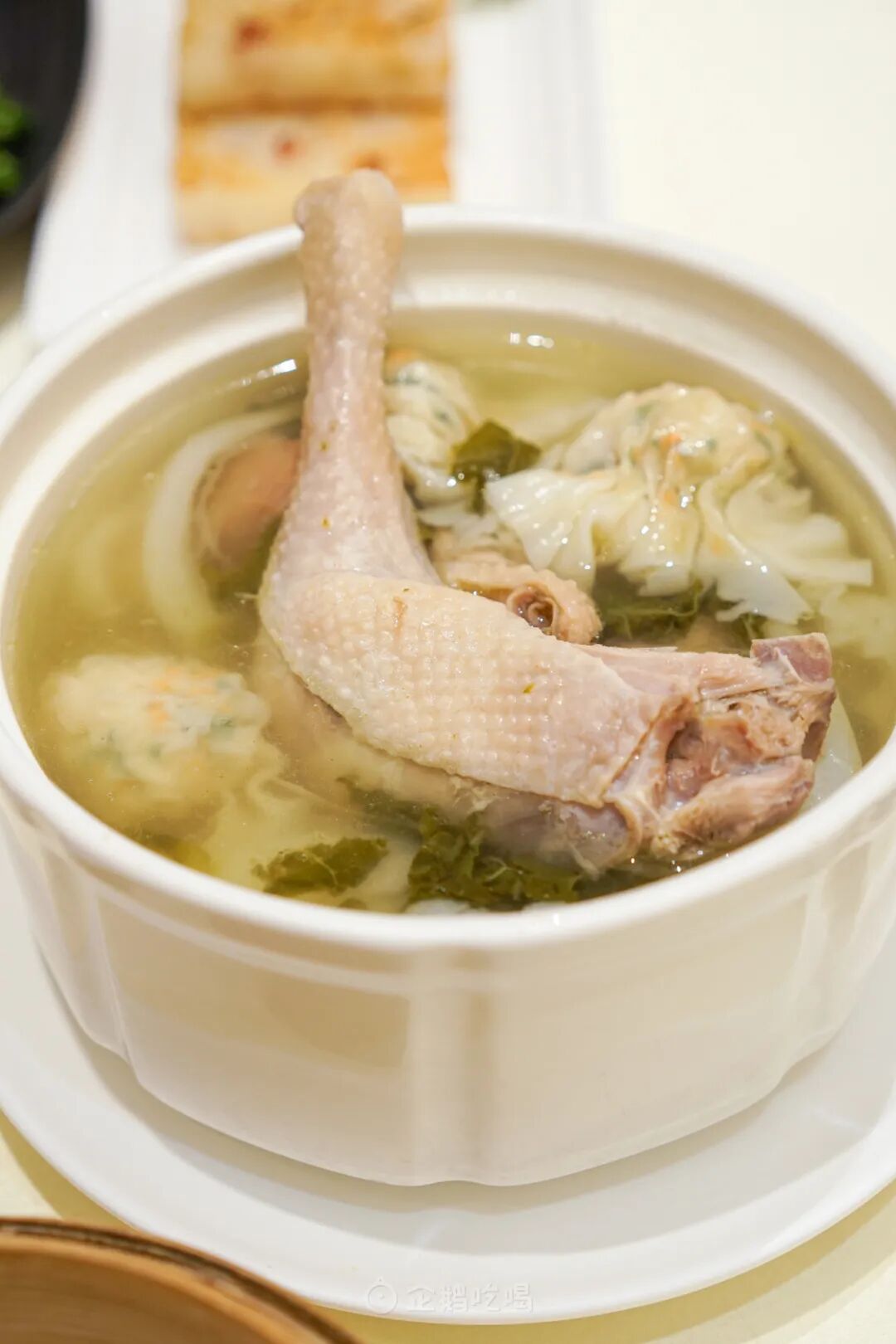 咸水角的油炸火候也很好,没有多余的油膉味(就是油温过高或用油不好产生的不悦味道),外层脆,中层糯,内里香,三层合一糯叽叽,糅合着浓郁的肉馅香。还有这枚粉嫩嫩的“屁桃”,其实是现今已很少见的寿桃包,也是旧时广州人生日必吃的点心。这里日常就有做,9.8元/份,是整张点心纸上身价最低的小点。莲蓉是淡雅的清香,馅体润得发光惹,还包有甜甜的蛋黄,满馅甘暖相融,对于很多广州人来说,是能闪回旧日记忆的温柔滋味。最后,还想特别说说一道手工菜「菜胆云吞鸡」,推荐它,是因为有一种广府手工菜的「雅」。由几道耗时工序组成,先取老鸡、赤肉、瑶柱、排骨、凤爪、火腿等主材炖汤,吊足6小时,之后要滤开油分与杂质,得一清透如水的高汤。比传统广式云吞上细致不少,内馅是百花,也就是虾滑与肉滑混合,拌入了粒粒蟹子,入口便有了哔哔啵啵的弹跳感,整体非常饱满扎实,但外皮却能又薄又滑,摇曳着舒展的金鱼尾,搭配着鲜美醇甜的汤头享用,云吞的香气就有了回韵。看似组合简单,但鸡汤炖浊了,云吞煮久了,菜胆时机不对,任意一步疏忽,都有满盘皆落索的风险。而这一道就做到了汤醇菜美云吞香,清鲜馨雅的一体感,有种含蓄细腻在骨子里。主要是选料精,味道正,是很有底气的老广风格菜,开业不久便成为了城中富豪饭堂,引起城中热话的程度,不早点预订都吃不上!