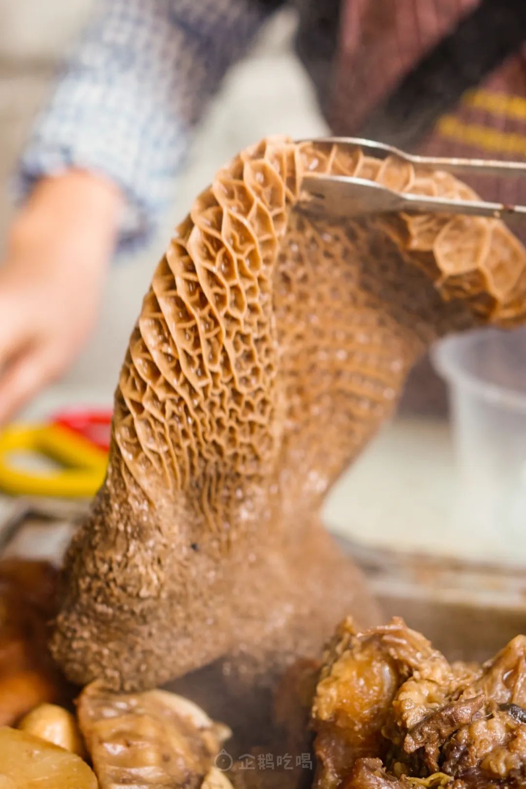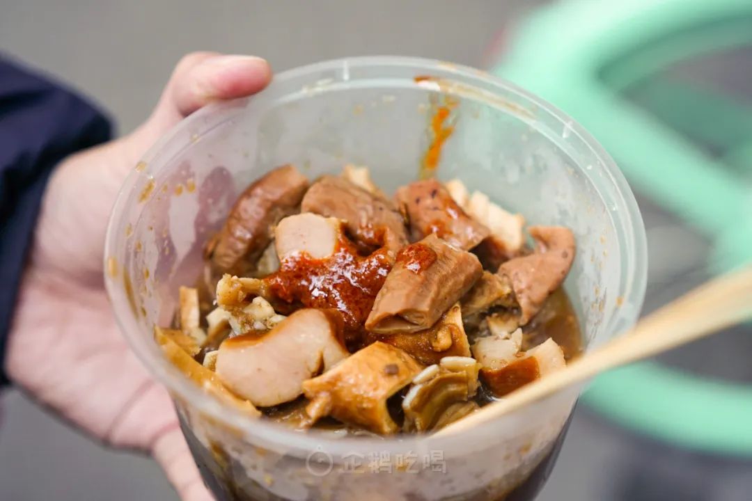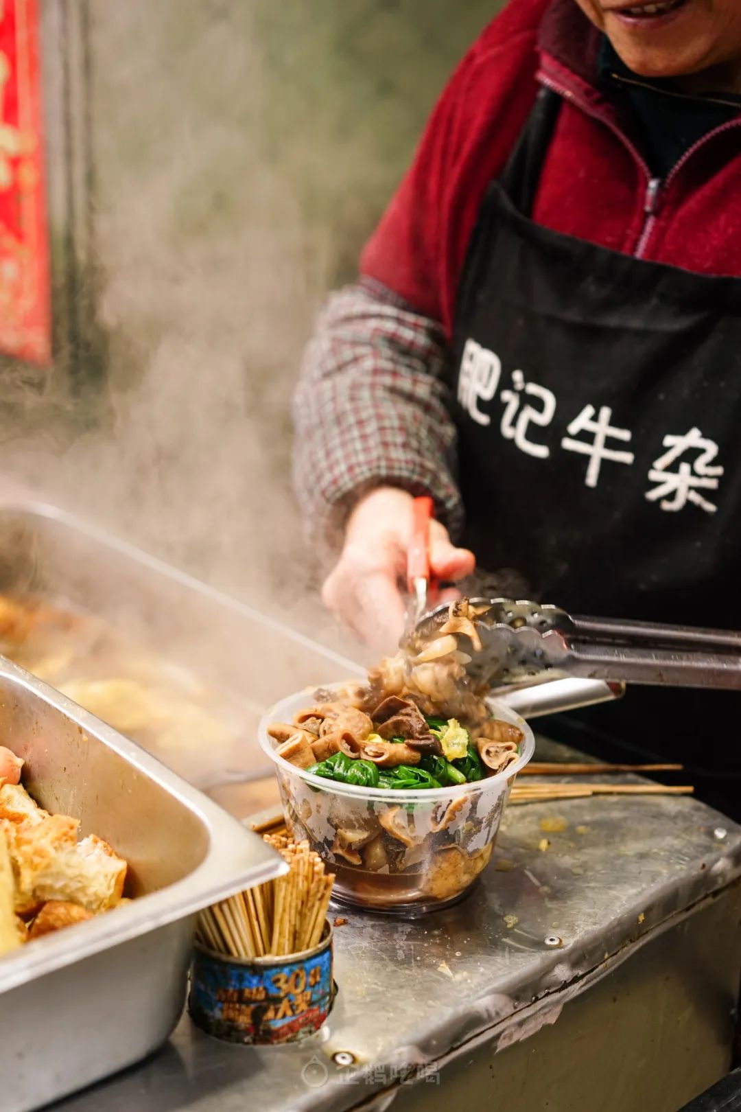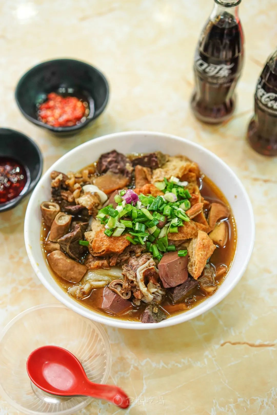 而另一家是走鬼档牛杂,就在江南西的紫来大街内,是经营了17年的老车仔档了。这家的特色是部位众多,把牛下水一锅打尽,随便数数就有牛肺、牛膀、牛肠、牛脆骨、牛筋,而且牛肚也有分常见的毛肚和更矜贵的金钱肚,还有少见的牛心腚。也就是黄喉。酱汤的调味克制,酱香不会过甜过咸,没有盖掉高汤本味。虽说所有牛杂都是共炖一锅,但不同部位口感各异,其实下食材的先后次序和炖煮时长是有讲究的。如果一家牛杂每一个部位都是同样的绵软,那是偷懒的表现。