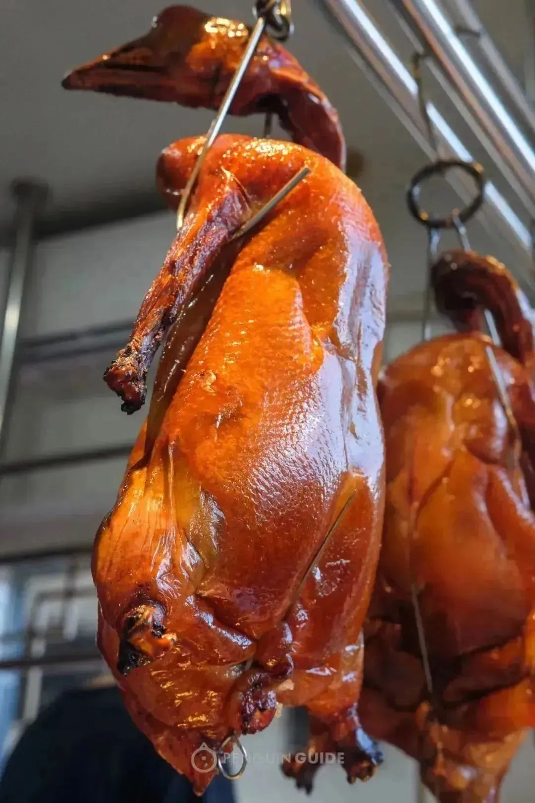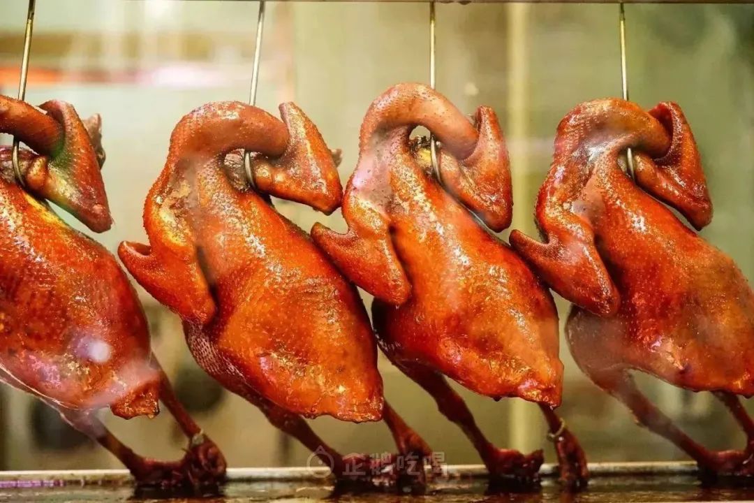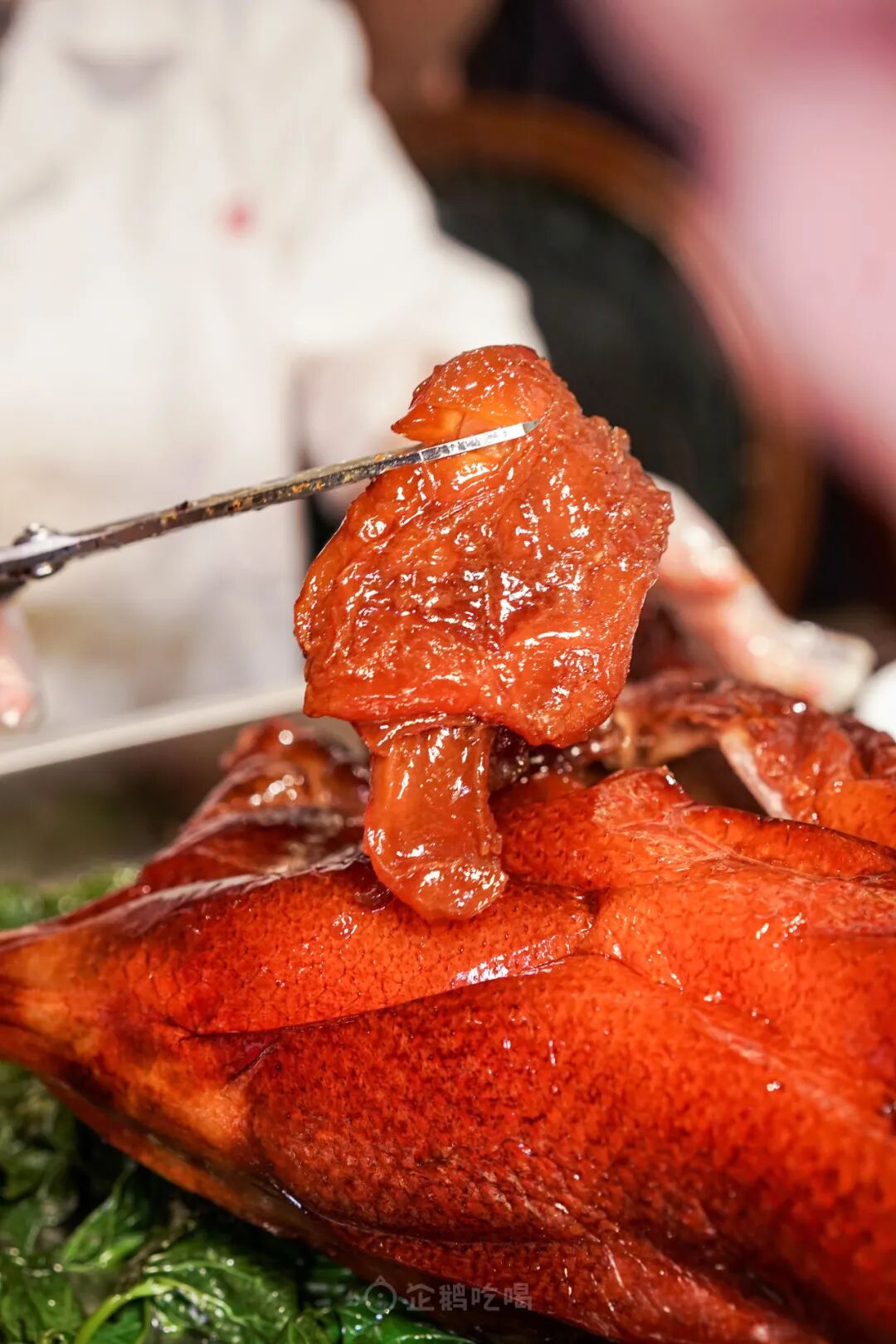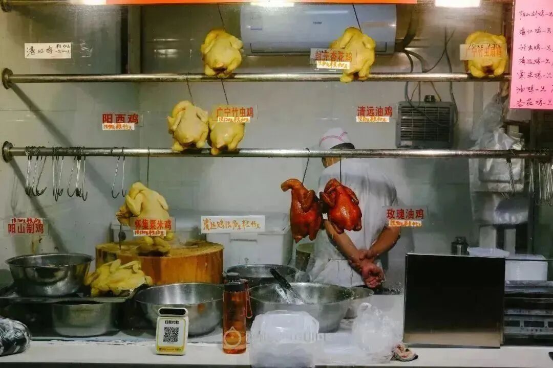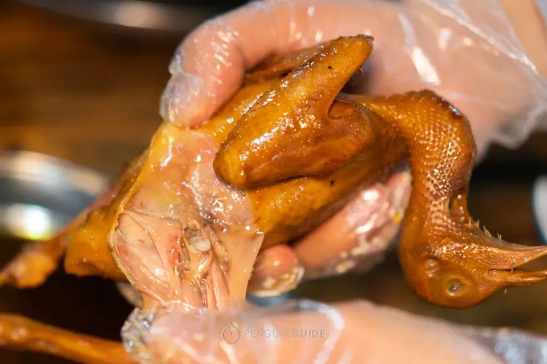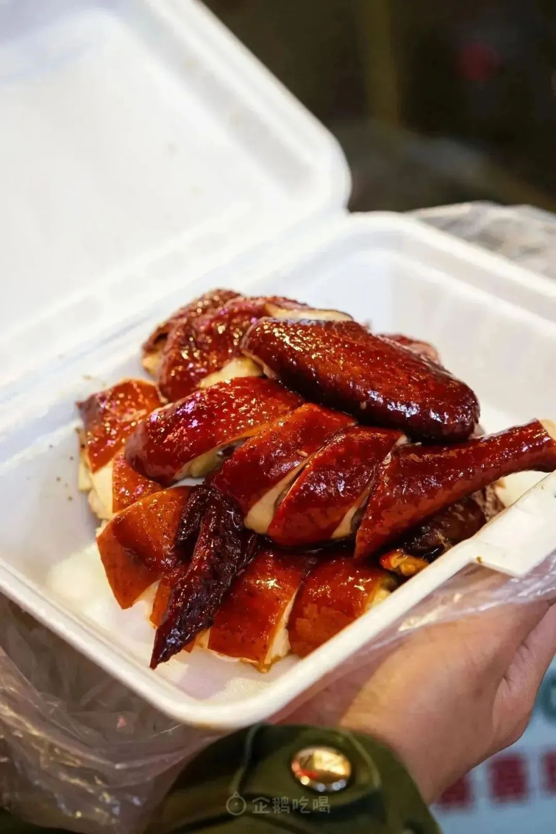 还有素扎蹄,则是将腐皮层层包裹成条状,吃的是另一种扎实的口感。在斩料烧鹅这一块,开业40年的永兴烧腊,在调味和烤功方面都接近完美。他家烧鹅是标准的“荔枝蜜色”,皮薄肉脆,香料味复杂又平衡,而且充分渗透入味,细尝还会有微微回甘。最诱人的要数这只鹅髀(鹅腿),位于火力最集中,汁酱吸得最足的下庄(鹅身下半截),也是整只鹅肉质最滑、最厚的部位。下单时说明“半边下庄留髀”,就能得到一只完整的,可直接手抓痛咬的整腿。豉油鸡虽然是烧味店的常驻角色,但要说做得好的却廖廖无几,毕竟好的豉油鸡在火侯、调味方面功夫不少,算是一道功夫菜。外皮枣色均匀,入口酱味不会过重,可见豉油糖水比例调配得当,更重要的是鸡肉仍保有弹性,即便下午才去买,体内还是微温的。就连蘸酱也是特意调味煮制过的老抽,太好吃,简直把许多名店都比下去。大部分烧腊店,手撕鸡只是可选品类,而这家胜记万利烧腊店,却是专精于做手撕鸡,且在鸡种选择上能做到覆盖全省靓鸡。几平方的小店,就能买到湛江鸡、杏花鸡、阳山鸡、广宁鸡、怀集鸡、清远鸡和文昌鸡等。鸡的摆放按玻璃上标注的鸡种划分,来晚了,有些鸡种已经售完啦。最神的,还有师傅手起撕鸡,手落拌酱,举盘翻搅的一套回旋掌,如看高手过招,三两下就让鸡肉裹上自家秘制的汁酱,咸香十足。