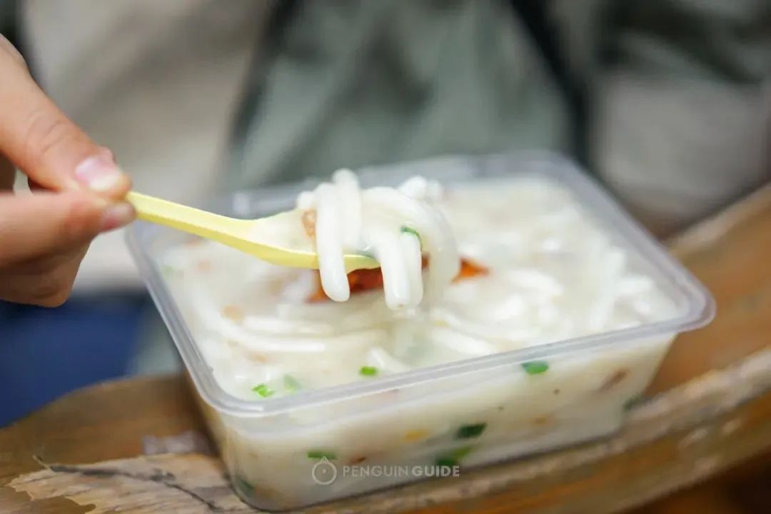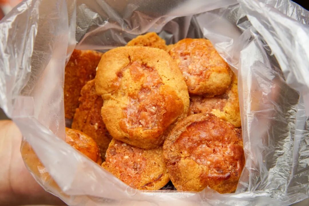 而另一份推荐必试的砵仔饭,是看似极家常的「酿辣椒砵仔饭」。这日的辣椒体积尤其粗肥,快赶上一根青萝卜了,肉滑填得满腔满腹!常见酿辣椒多是填上猪肉滑,但这里是加入了鲮鱼的肉滑,用料成本也更高,经香煎后搭上微微辣感,饶富滋味。这家祥兴,虽然是小小的蚊型店,却愿意做许多小店都不愿意做的品类。例如「沙翁」,是如今几近式微的古早点心了。拿起还是暖烘烘,能吃到细密糖霜与内里的蜂窝组织形成脆糯的口感碰撞。沙翁实在太讲究尝味时限了,做好后就要短时间内趁热品尝,才是口感最佳之时。但这样操作成本太高,所以很多店都是大批量制作,放置售卖,沙翁一旦久放,糖霜融化,油分泄出,组织塌陷,此时再吃,就像生吞吸油海棉,腻到入心入肺……