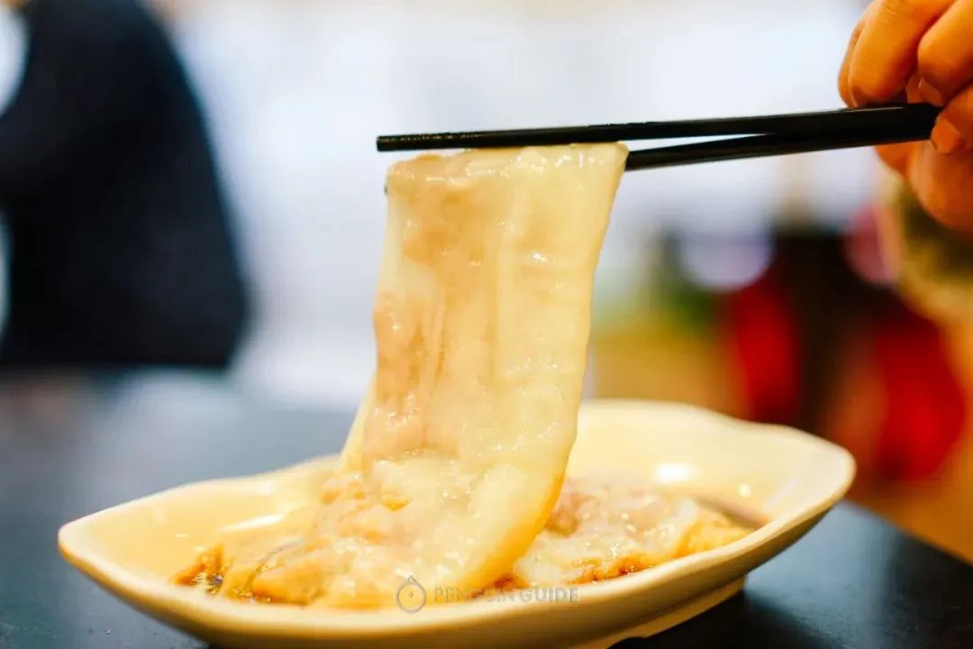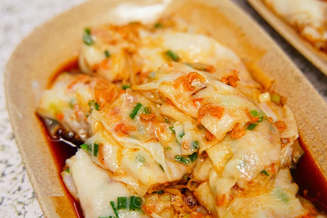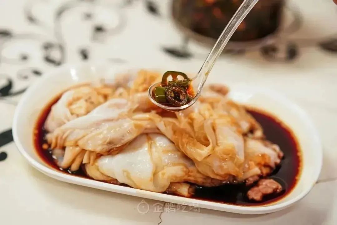 这家店就做到每早新鲜煮制,清洗得干净之余,还在汤底里加入了药材辟腥,味道便醇厚了起来,吃起来舒服落胃,不得不佩服广州人在螺蛳壳里修道场的细致。作为广州小吃中的头牌,肠粉赛道实在是竞争激烈,先推荐四家,各有不同亮点。华记是城中少有的还在使用石磨肠粉的小店,米浆略带厚度,能吸收更浓的酱汁香气。推荐加上自家制的辣椒圈,香中透着鲜。配上一碗绵滑的及第粥,这份元气早餐组合仅需20元。炜明是在老广心中颇有名气的老店,坚持只用更讲究的单层铁皮抽屉式蒸炉,受热快且均匀,能让肠粉达到柔韧嫩滑的最佳口感。但与多层蒸炉相比,出品效率大减,所以店家宁可安置两个炉,由两位师傅同时作业,以人力跟上产能。在这里能吃到一些很传统的肠粉,例如虾米葱花肠。肉眼可见的虾米不少,而且还是事先炸香过的虾米,再撒上葱花酱油,配上咸香的特调酱油,生香之余,还有细细碎碎的脆感,令人感叹的儿时味道。另外推荐的还有炸面肠,也就是在肠粉里包入油条切段,吃的是嫩滑粉皮与松脆油条形成的口感反差。因为讲究油条的脆度,所以只建议在早上点,要是看到摆在一边的油条已经软扒了,就不要点了哦。或许也有人喜欢厚米浆派的选手?那么这家六记就是代表,肠粉厚身且滑溜,咬下带点回弹,推荐三鲜肠粉,同时拥有三种馅料,口感大满足。城中有多家肠粉店都叫六记,我们推荐的是龙津东路这家。先来一份牛肉肠粉,牛肉切得厚薄适中,且用量大方,粉皮虽说不上透薄,但厚度刚好能完美裹住鲜牛肉,入口微糯,鲜牛肉香气十足,有自然的嫩滑口感,酱油微甜,十分香口。