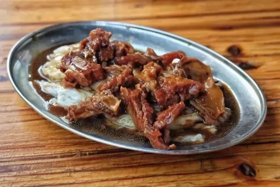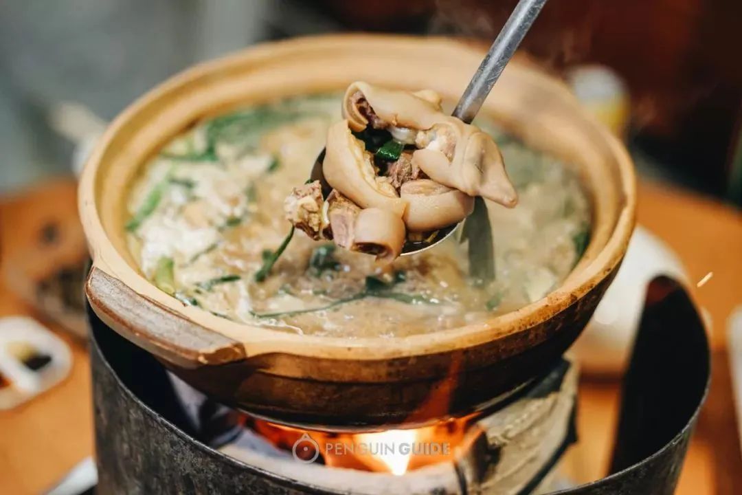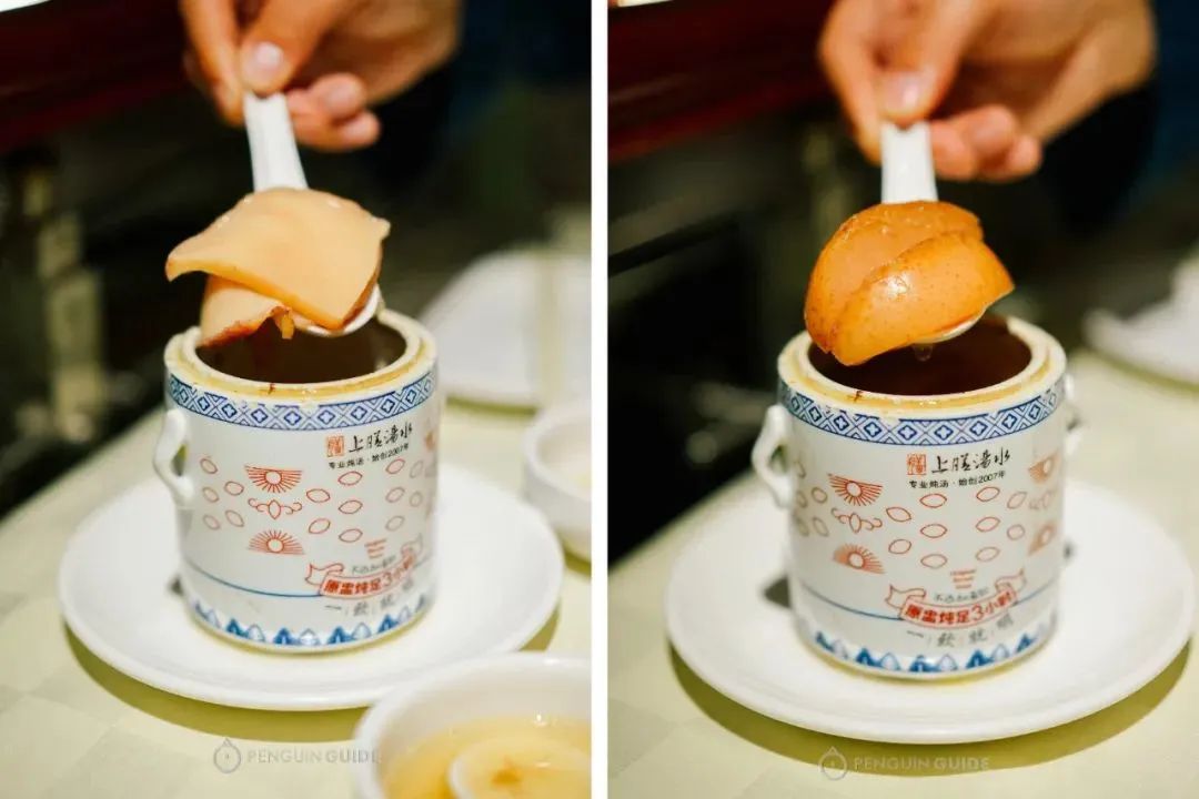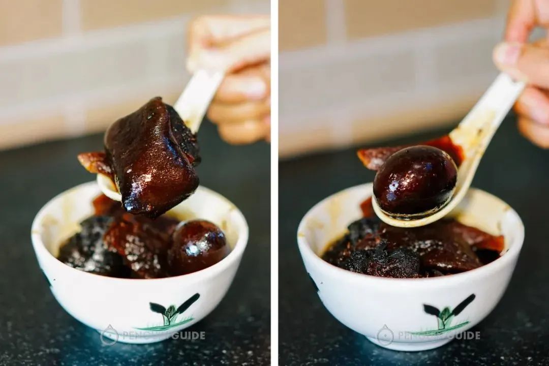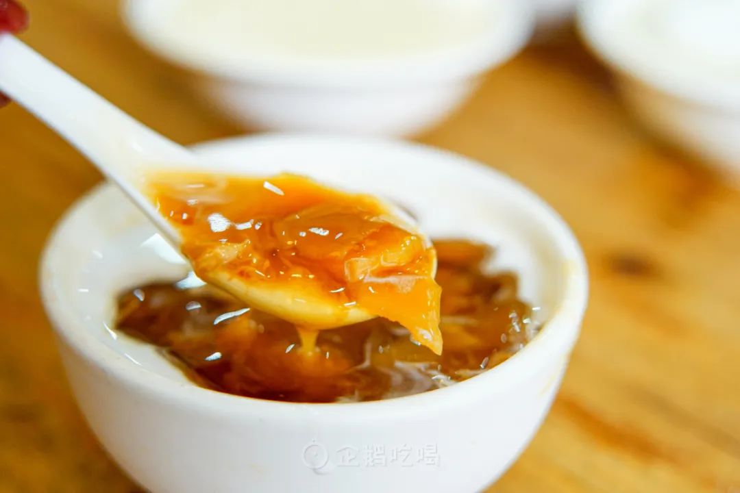 看似寻常的汤圆、茶冻,全是自家制作,不用半成品,在小小一碗糖水里投入了相当高的手工度。而且还不是简单的芋圆小料,像海底椰、冰雪莲、皂角米、芦荟这些较贵的食材都煮得出彩,足见选材和处理的心思,是到位了的。来这里最常点的,还有川贝杏仁露+黑糯米+冰雪莲海底椰茶冻凉粉、雪花冰和自制雪糕,都很不错吃,因为料很足,吃完巨饱!一家被奉为文物的百年小店,专注做一碗猪脚姜加蛋,食材在甜醋中慢火熬煮至少4个小时,煮出一身黝黑,每一口都软腍入味,连姜片都更加温暖柔和。