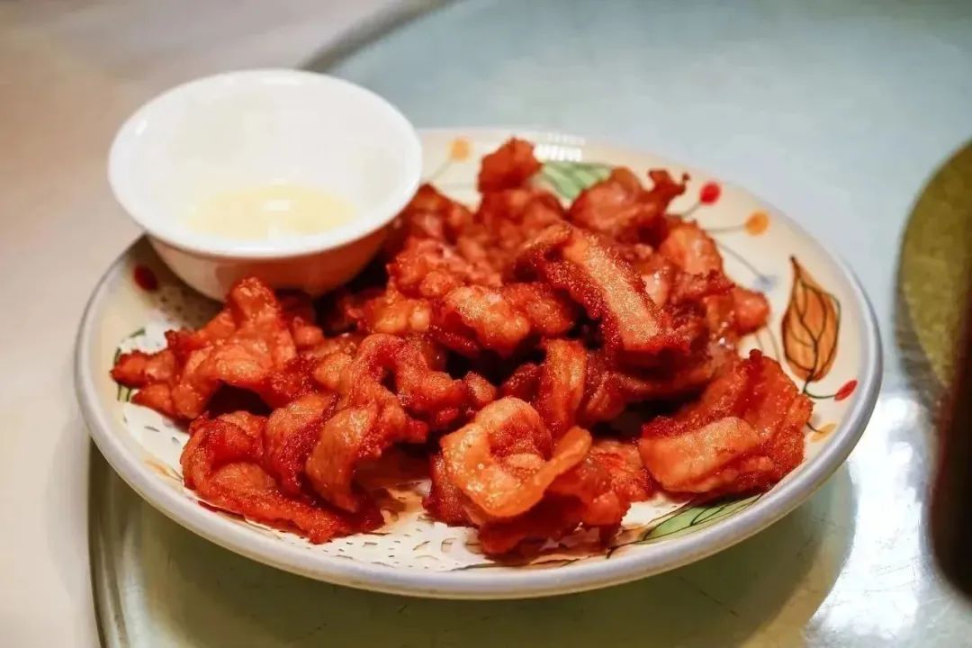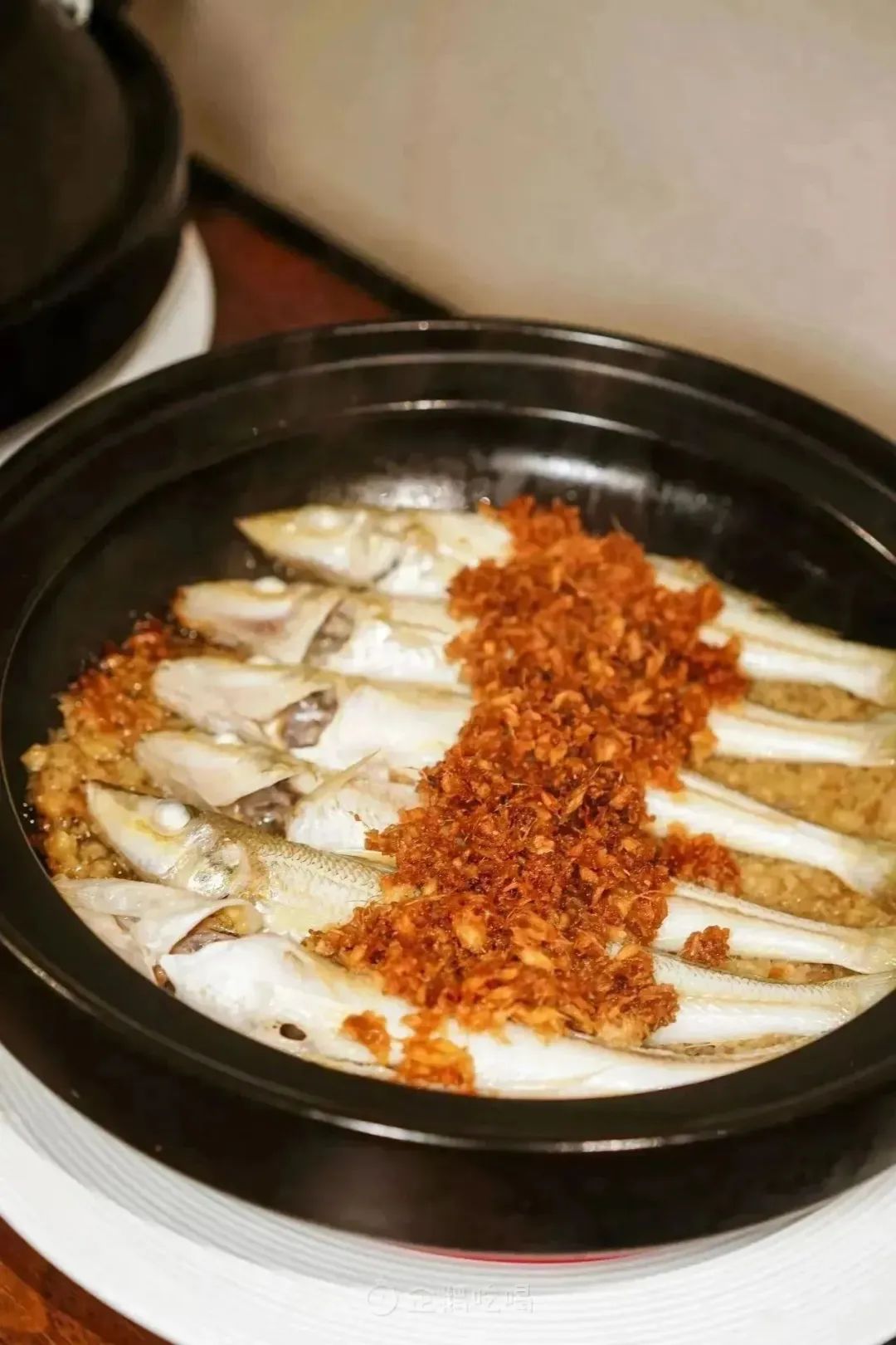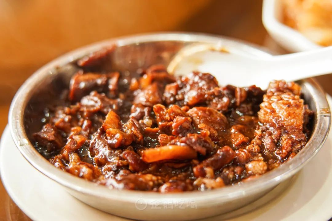 所谓煎封,是把酱料煮至轻微焦糖化,形成适当的粘稠度,浇在炸制好的多宝鱼上,瞬间封住温度,火候很难掌握。要吃这个做法,就点煎封多宝鱼」,外层润、中层脆、内层嫩,海鲜类可以盲点的菜还有很多,例如姜葱炒蟹,酱爆蛏子、椒盐泥蜢、泥鯭粥、红烧/煎焗白鳝煲、避风塘九节虾等等,我们反复吃了多年都不觉厌倦。信记的打开方式二:一些熟客才知道的预订菜,都是功夫。例如城中少见的丁香鱼煲仔饭,淋上两碗酱油充分拌匀再吃,丁香鱼体积虽小,但释出的鲜香很是细腻淡雅,一口下去鱼米合一,酱香揉和着湿咸海味,温和弹润于齿间。如果是第一次来,也推荐先把常规的招牌菜吃上一遍,例如南乳肉、节瓜筒骨煲、蒸肉饼、红葱头鸡,还有普通餐厅不多见的小泥鯭,这里可以选择两吃:椒盐,求个脆香;煲粥,尝口鲜甜。◎ 信记最知名的招牌菜南乳肉,很特别地蘸着炼奶吃,很好吃,但偶尔也有炸得不够透,口感欠佳的情况。