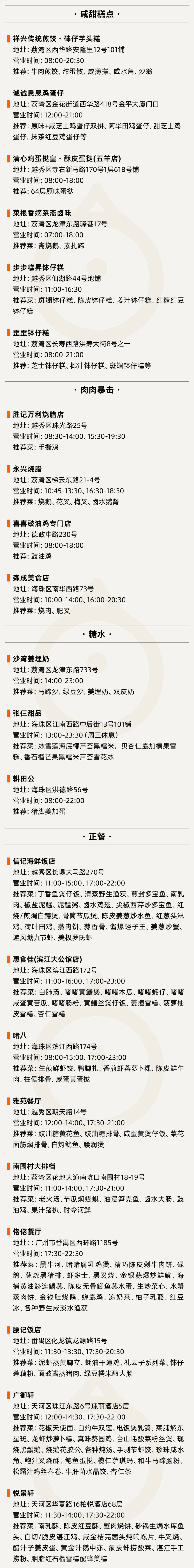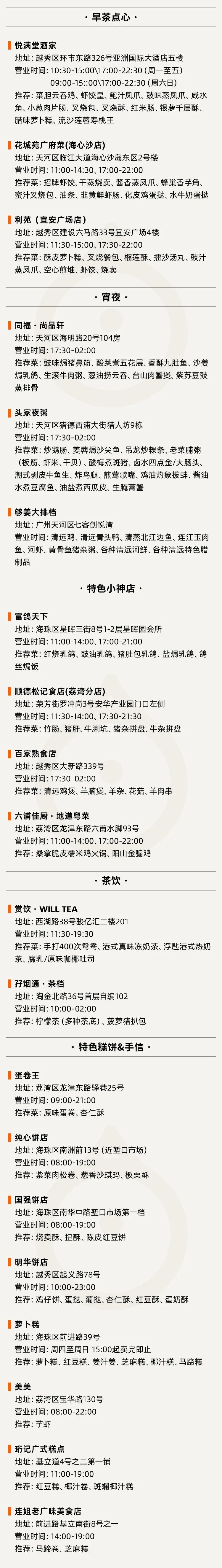 饭焗得粒粒分明,用的还是韶关的油粘米,米香浓且口感柔韧。在不同季节到访,发现店家还有很多隐藏菜单,比如夏天用时令的瓜凉拌鸽片,秋冬则是热腾腾的猪肚煲乳鸽。这家店之前是农家菜格局,最近迁了新址,环境要好了一些,注意不要跑空哦。做清水火锅的店那么多,吃了这么多年,我们依然认为最稳的还是松记。屹立了三十余年的清水火锅,几乎以一店之力,撑起了整个南派火锅的门面。松记的厉害之处在于,这么多年来,食材鲜度总是在线,服务还特别专业。这家店的阿姨都经过培训,熟练掌控汆烫火候,呈现各种食材的最佳状态。食客不必自行动手,只管埋头吃就行了。必点每日限量的竹肠。这是猪肠中占比不到10%的部位,入口弹、爽、脆,还能爆出一腔浓郁的油膏,称得上猪肠界的翘楚。入口先品到浓郁的牛油香气,随着咀嚼,会慢慢涌上一股奶味,非常神奇!如果人数少,建议点牛杂或猪杂拼盘,就能一次性多试几种部位,real贴心了。另一种老广挚爱的火锅,就要数鸡煲和羊煲,我们常去这家老字号百家熟食店。羊腩煲、清远鸡煲都是一绝,至今还保留着传统炭炉火锅形式。最红的时候,排队的人挤满大半条街。羊腩煲价格不便宜,但十分真材实料。用的是正宗东山羊,几乎没有膻味,而是散发着淡淡奶香。因为每天宰羊,食材流通快,还能吃到少见的新鲜羊杂:坚持调配、冲煮、拉茶一切步骤亲自来,愿意如此用心的店不多了。尤其喜欢这杯热鸳鸯,舍得花时间打出一层绵柔的奶泡,入口更加醇厚,幸福感拉满!推荐搭配腐乳咖椰吐司一起服用,组合简单却有滋有味,是我等升斗小民的朴素快乐。而另一款地方名饮,要数柠檬茶,广州的柠檬茶店基本遍布每个小区角落,是提供给广州年轻人聚众开黑社交之地。柠檬茶有绿茶、红茶不同品类与产地茶底可选,而且针对懒人直接标注口味的甜涩之分,最终选了鸭屎香茶底,柠檬香气足,茶香甜度适中,入口清新顺喉。而在这里喝柠檬茶,最爱配上一个猪扒包,酥皮热烘烘,掀开一看鸡扒大块到发指,且是一整块连骨扒,real有诚意了。如果说脆脆酥酥的糕饼也有季节性,那么到了秋冬,那就必须是现烤蛋卷的王道了。这家蛋卷是现烘的,香气飘至满巷,蛋香足,入口酥脆,既可以即买即食,也很适合买几袋回家。原味的就可以,肉松没必要,微微降温再吃,松化的层次圈圈叠叠,密集的气孔夹杂其中,一咬瞬间碎屑飘飞,蛋香在浓郁还带着烘烤的香气,为了这一口,值得守在炉边等候。这家手工小店的各种合桃酥、杏仁酥也很推荐,体积小且酥化,每次都忍不住囤一袋做小零食。@纯心饼屋、国强饼店、明华饼店、萝卜糕、 珩记、连姐老广味大家或许不知道,广州的传统糕饼虽然没有确切的官方统计数量,但从整体广式点心的范畴,通常认为有超过 1000 种!而广州几乎每一条街道,都至少拥有一家以上的自烘焙老饼铺,全日出产几块的小糕小饼,这些小点,日常可当零食,送礼手信也不礼,快速总结一下可以光顾的店家。如果喜欢鸡仔饼、杏仁酥、蛋挞、我们最终认为综合评分最高的,还是明华饼店的出品。
