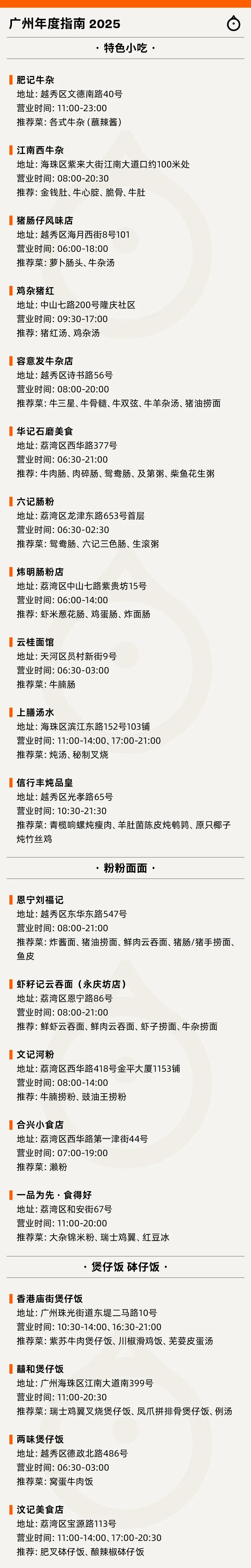 我们每一年都会移除不够出色的店家,也加入宝藏遗珠,努力让榜单持续进化。今年合共选出62家餐厅与小店,其中21家为新上榜,是变化最大的一期。合共12个类别,从市井小吃到地道碳水、早茶点心到正餐宵夜,还有烧味、糖水、糕饼、手信等全数收录。希望这是一份让游客吃出精髓,同时也能说服挑剔老广的可靠榜单。● 好吃且深有特色。要么功底深厚过人,要么是品类里的佼佼者;● 都是我们反复回访(甚至有些超过10年)、水平稳定的选手,可以放心带外地朋友去。不仅选择多样,还告诉你们哪些好吃和为什么好吃,所以篇幅也是史上最长,大概很难一次消化,建议先拉到文末把超详细List收藏起来,回头慢慢享用。全部自费客观测评,请各位动动手指,点赞+在看+转发,是给我们这份榜单(吃出工伤)的最大的鼓励:)1、 所有餐厅均是自费食评,和文中店家没有任何利益关联。2、餐厅是一门手艺生意,难以保证每一道菜在每一次都表现最佳,我们尽量反映日常状态,不苛刻不吹捧。广州主流的牛杂是柱侯酱汤派,属于较容易藏拙的做法(柱侯酱的浓咸很容易掩盖食材的鲜度)。即便如此,依然有店家愿意雕细节,做到材料鲜度、汤底调味、以及炖煮后的味道与口感都同样出桃。她家的牛杂,酱汤是一绝,除了醇厚的牛骨汤作底,还有略带药膳香气的香料助攻,没有让柱侯酱盖掉层次,选材新鲜之余,香浓之味充分渗透牛杂内部。很多人不知道的是,牛杂阿姨虽然能说流利的粤语,但其实是祖籍四川人,所以她的汤底更会利用香料,有独一份的风味。还推荐阿姨自家炒制的辣椒,鲜香非常,暂时没有吃到其它牛杂店有比她更好的辣椒,所以每次吃都自带容器让阿姨卖一点给我。