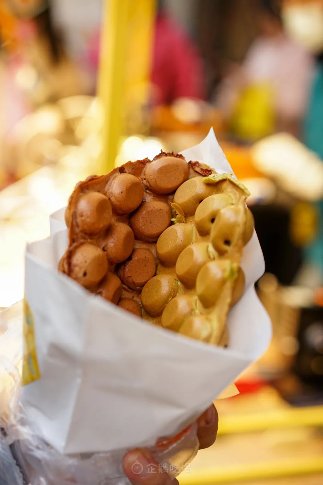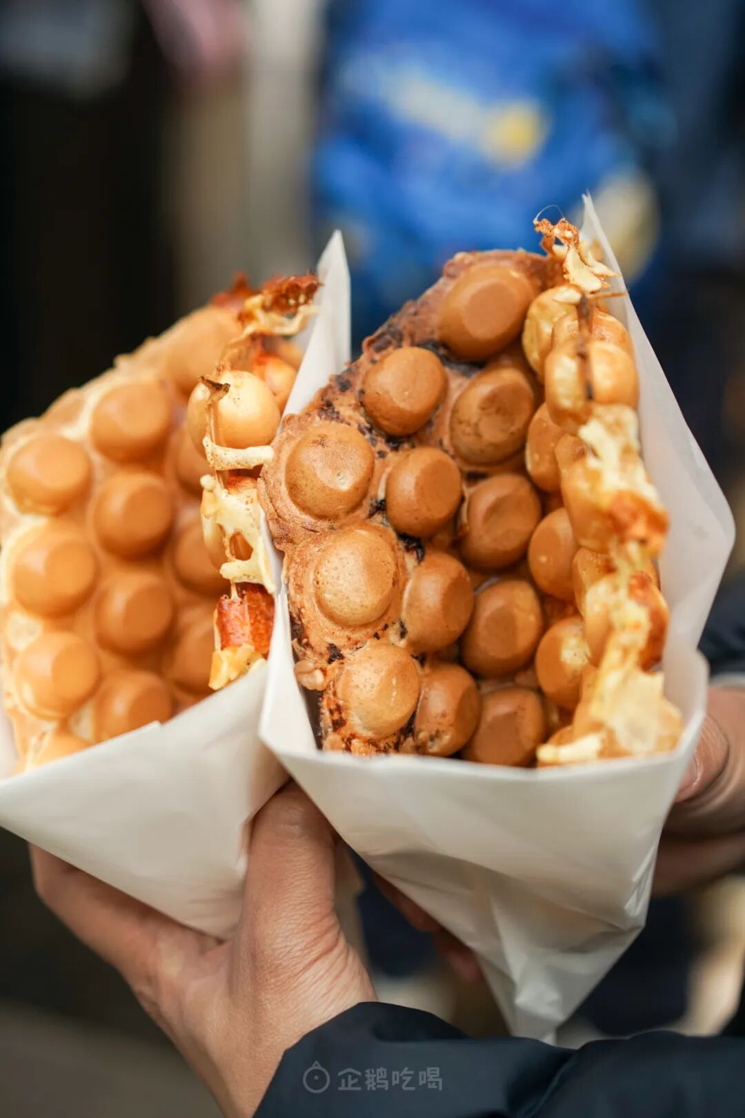 我们首推的是原味,酥皮松化间还带点承托力,装着饱满蛋浆,入口嫩滑疏松,有阵阵牛油香,唯独是蛋香气不够重。但也得夸一夸,店内不会一次过大批量制作,而是小批量分次出炉,卖完一批再烘烤,所以时常能碰到新鲜出炉的蛋挞,热烘烘吃上,仅需5.5元,幸福感加倍!应该是全城最诚恳的鸡蛋仔,口味众多,还愿意照顾客人花心的喜好,可以自由组合双拼鸡蛋仔,还可以要求焦脆一点或者软一点。就连蛋浆也多一重心思:一般的鸡蛋仔档,都是统一的蛋浆,然后填上不同口味的馅,但这家的蛋浆会根据风味另外调配,仅是调味蛋浆就有至少四种,除原味外还有抹茶蛋浆、阿华田蛋浆、朱古力蛋浆。如果点相关口味,那浓郁的风味便由外及内,非一般鸡蛋仔可比。个人最喜欢的是原味拼咸芝士,车打芝士填得满满当当,经模具加热,芝士会形成焦脆的边边,就是常说的美拉德反应,咸香得相当上头。
