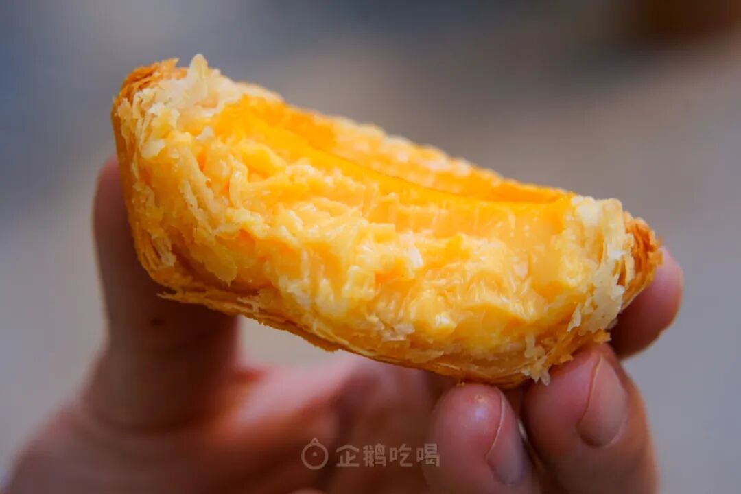 也推荐「咸水角」,油炸火候到位,脆皮没有吸收过多的油份,入口脆中带香,外皮厚薄适中,和内馅缠咬一起咸香俱有。如果全城的糕饼铺里,只能买一家的蛋挞,那这家是我们的首选。厉害之处在于做出了64层的酥皮,城中少见。其实不是层数越多越好,其中的手艺点还在于师傅压挞皮的力度,不能太用力,也不能太轻,而是要用恰到好处的阴力,才能压出质素高的挞皮。经焗制后,酥皮才能层次分明,酥脆间带有空气感。喏,优等生!
