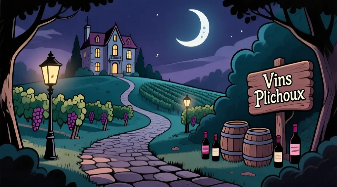 - A whimsical, color-rich night scene in the DOTTRMSTR style. A winding cobblestone path, illuminated by charming old-fashioned lampposts, leads the viewer's eye through the foreground and curves off into the distance, passing by the main scene. A grand, slightly eerie mansion is prominently situated on the crest of a distant hill, which is entirely covered in neatly arranged rows of grapevines, clearly indicating a sprawling vineyard. Its numerous windows glow warmly against the night, but no visible path directly connects to it from the foreground. To the right of the path, nestled among lush foliage, a prominent wooden sign with elegant lettering reads "Vins Plichoux," indicating a winery. Nearby, stacks of wine barrels and various wine bottles are visible. The night sky is dark, yet a bright crescent moon hangs above, casting a soft glow over the landscape. Silhouetted trees frame the scene on both sides, their branches reaching in from the edges. The overall ambiance is enchanting and mysterious, inviting exploration of the "Vins Plichoux" estate by moonlight.
