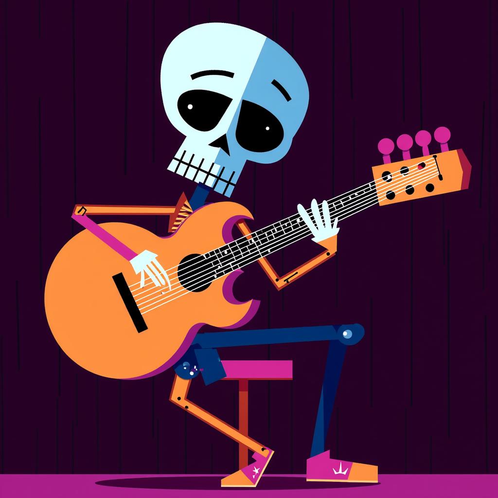 CBSTCRTN cubist cartoon portrait of a mexican skeleton playing the guitar. Dark wooden background. neon lights