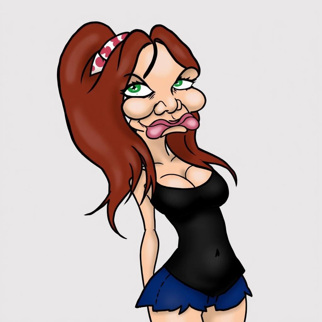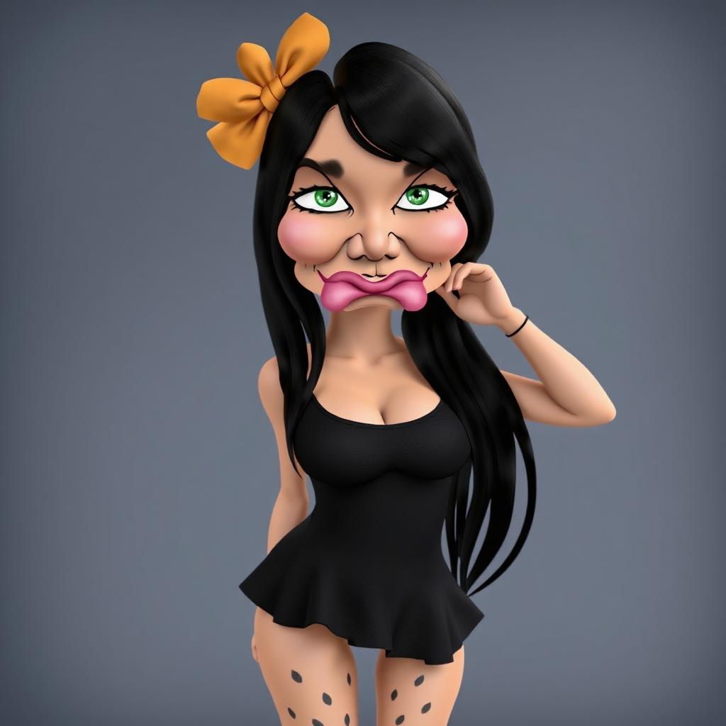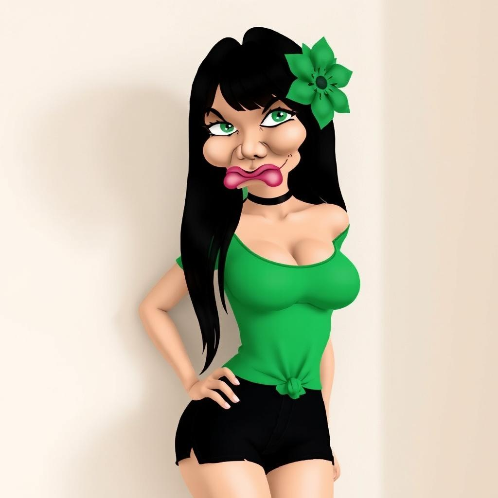 3d animation pixar style STYPRS girl, The image is a color photograph of a young woman posing in a casual indoor setting. She has long, straight black hair with bangs, and a large green fabric flower is pinned on the right side of her head. Her hair contrasts against her fair skin, and her expression is neutral, with her lips slightly parted. She is wearing a fitted green t-shirt, which is knotted at her waist, accentuating her figure. The shirt has short sleeves and a low neckline. Around her neck is a black choker. She also wears a short, black skirt, which sits high on her waist. The lighting in the image is soft and even, casting minimal shadows, giving the photograph a clear and direct feel. Her right hand is resting on her hip, while her left arm is relaxed at her side. The background is a simple, light-colored wall, creating a neutral backdrop that keeps the focus on her. The overall vibe of the image is modern and casual, with a sense of personal style.