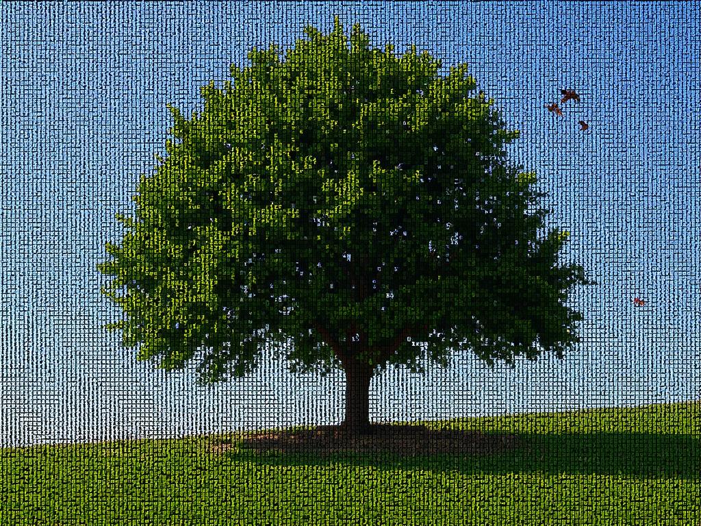 - ASCII art, a tree in a peaceful meadow, with birds flying overhead