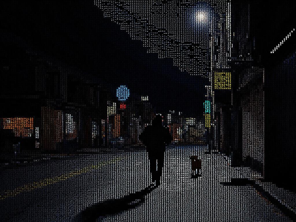 - ASCII art, a person walking their dog through a quiet city street at night