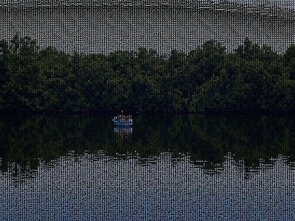 - ASCII art, a small boat on a calm lake, surrounded by trees