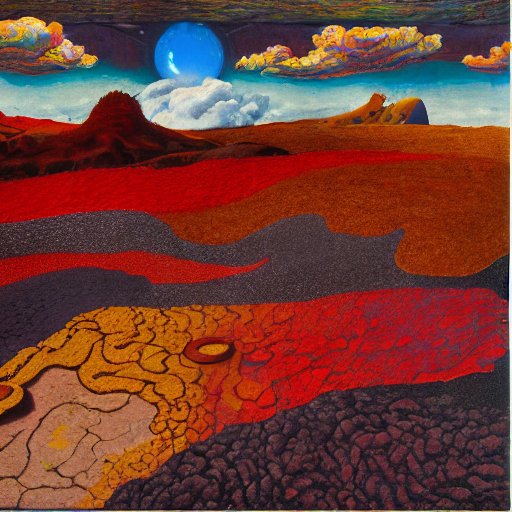 I improved upon the command using lexica, adding the artists: kevin sloan andre masson jacek yerka jackson pollock giotto kitsch. The full command is: "style of vermeer, , energy shadows melt lava pebbles, red lava pebbles, colorful lava pebbles, colorful mountain, tumultuous shadows, clouds and lava, kevin sloan andre masson jacek yerka jackson pollock giotto kitsch, concept art , colorful, Intricate modular synthesizer of wonderland, golden ratio, oil on canvas"