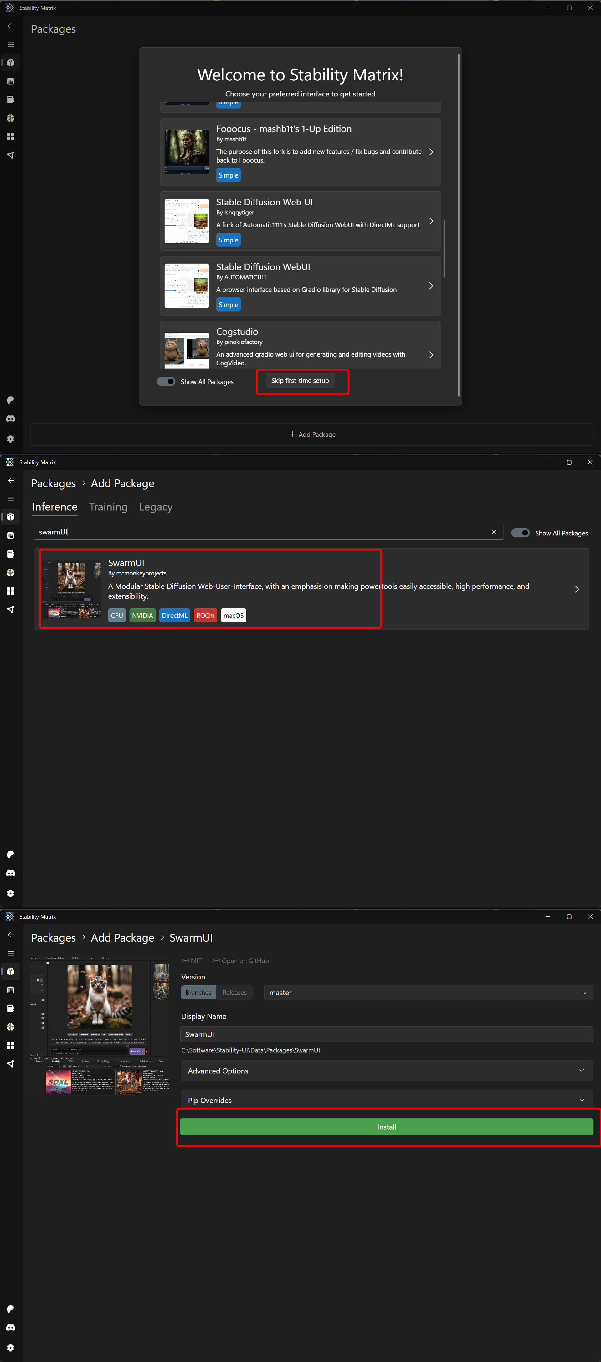 The only caveat is that you’ll need to press “Skip” on the first screen in StabilityMatrix and find SwarmUI in search manually