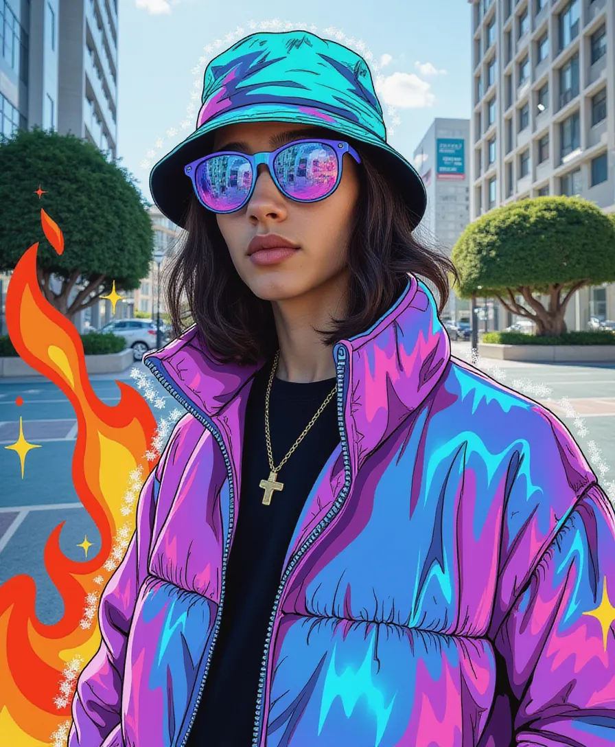 - In the style of TOK, a photo editorial avant-garde dramatic action pose of a person wearing 90s round wacky sunglasses pulling glasses down looking forward, in Tokyo with large marble structures and bonsai trees at sunset with a vibrant illustrated jacket surrounded by illustrations of flowers, smoke, flames, ice cream, sparkles, rock and roll